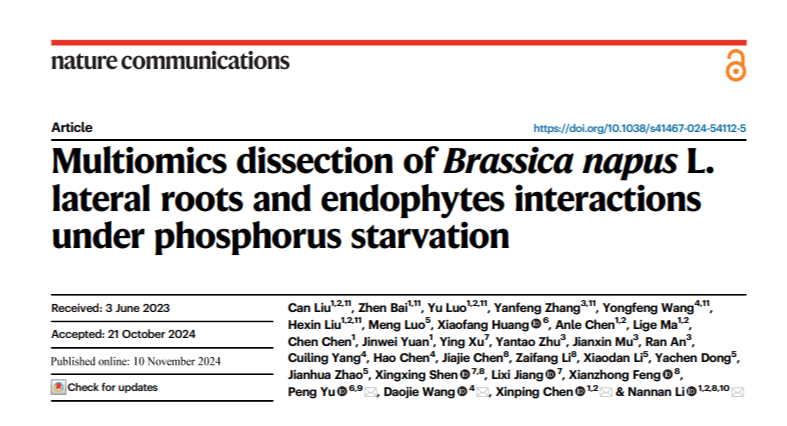 近日,国际著名期刊《自然通讯》(Nature Communications)在线发表了资源环境学院植物营养与调控团队的研究论文《多组学分析揭示磷缺乏条件下油菜侧根与内生菌的相互作用》(Multiomicsdissection ofBrassicanapusL. lateral roots andendophytesinteractions under phosphorus starvation)。beat365在线唯一官网登录为论文第一完成单位。学校李楠楠教授和陈新平教授为通讯作者,博士后刘灿为第一作者。该研究得到了国家重点研发计划、国家自然科学基金、国家级青年人才项目和河南省重点研发计划等项目的资助。