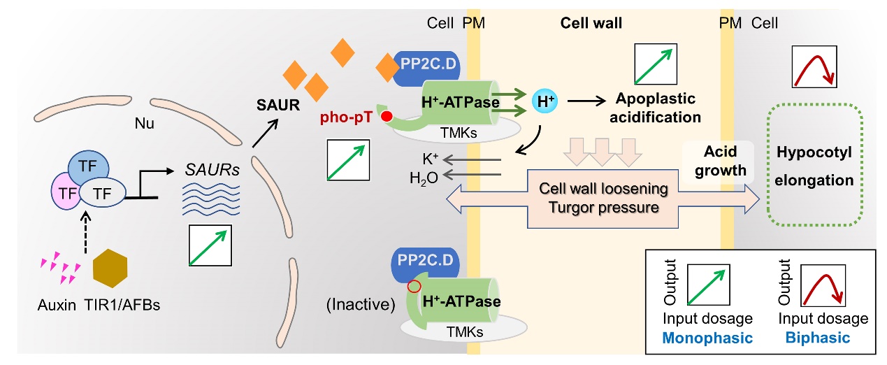 该研究发现,生长素以剂量依赖的方式诱导SAUR家族基因表达。随着生长素剂量的增加,SAUR家族蛋白水平逐渐积累,促使质膜质子泵H+-ATPase活性被逐渐激活,质子持续外流,进而促使下胚轴表皮细胞质外体被逐渐酸化。根据酸生长理论,质外体适度酸化促进细胞延展,而该研究发现当质外体酸化到一定程度则抑制细胞延展。因此,生长素的双重效应取决于细胞对质外体酸化程度(pH)的响应,且发生在生长素介导的转录重编程之后。光信号促使下胚轴表皮细胞质外体pH升高,抵消生长素诱导的质外体的过度酸化,使得生长素在光下促进下胚轴伸长。