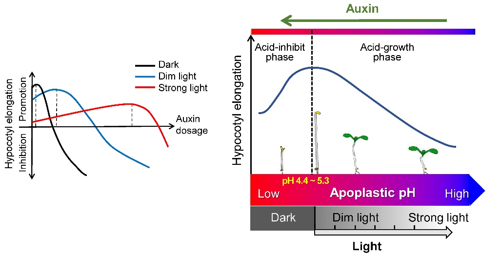 生长素是第一个被发现的植物激素,对植物生长发育过程至关重要,广泛参与调控细胞分裂、延展和分化等基本生物过程。生长素在调控器官生长时具有“剂量效应”(又称“双重效应”),具体表现为低浓度的生长素促进生长而高浓度的生长素抑制生长。生长素的这一特征发现已有近九十年,而背后的分子机制还不清楚。此外,生长素调控器官伸长的效应还受光等环境信号影响,如施加适量生长素在暗中抑制下胚轴伸长,而在光下却促进下胚轴伸长。这一现象发现超过二十年,背后的分子机制也一直不清楚。
