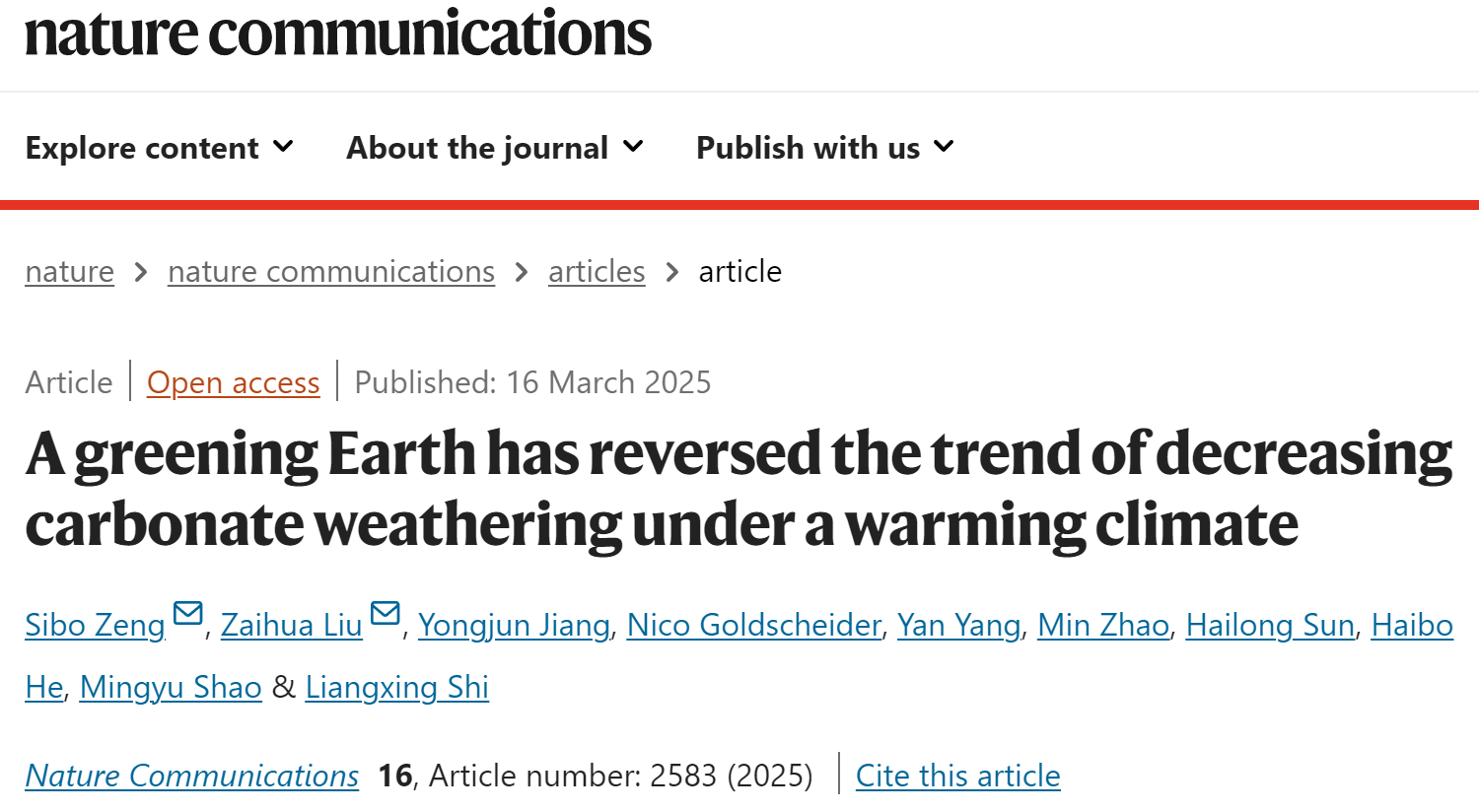 3月16日,地理科学学院曾思博、蒋勇军教授团队在自然期刊旗下子刊《自然通讯》(Nature Communications)发表了题为《全球绿化逆转了升温对碳酸盐风化造成的负面影响》(A greening Earth has reversed the trend of decreasing carbonate weathering under a warming climate)的研究论文。该研究发现过去几十年全球植被绿化促进了碳酸盐风化即岩溶作用产生的大气CO2捕获,同时证实了未来全球岩溶区的生态修复工程或可成为调控岩石风化碳汇的潜在抓手,这些发现具有重要的科学意义与应用价值。