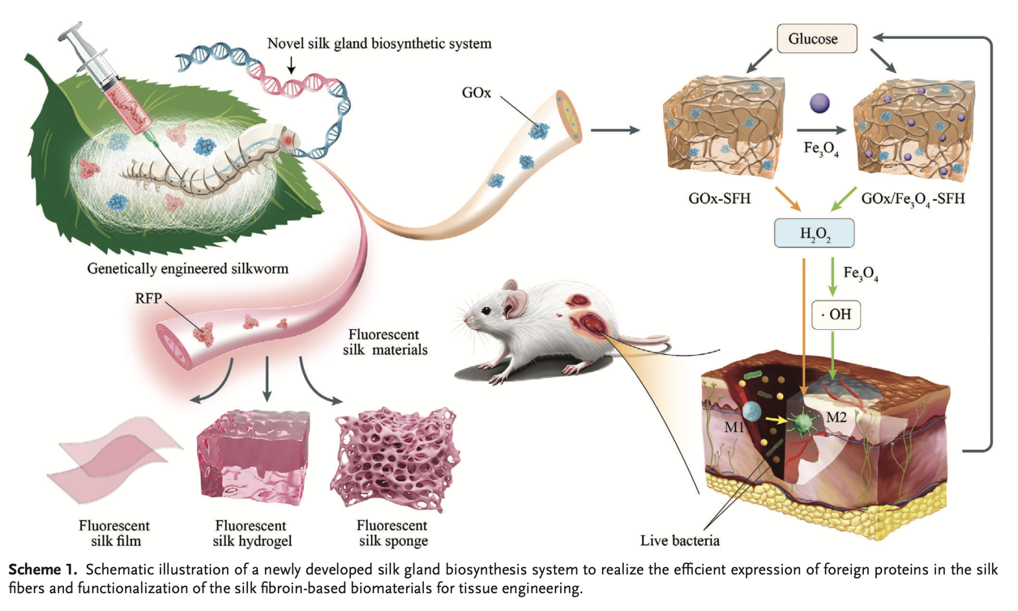 随后,研究人员利用家蚕合成的重组RFP蚕丝原料,开发了制备各类丝素荧光生物材料的技术工艺,确保了材料制备过程中外源蛋白活性。为测试丝腺生物合成系统的通用性,研究人员进一步创制了高效合成葡萄糖氧化酶(GOx)蚕丝的新型家蚕种质素材,利用上述工艺成功开发了具有抗菌活性的GOx-丝素水凝胶以及GOx-Fe3O4丝素水凝胶系统。该系统以丝素凝胶优异的生物相容性为伤口愈合创造良好的微环境,同时利用丝素中重组表达的GOx酶催化糖尿病伤口环境中的高浓度葡萄糖,产生具有杀菌抑菌的H2O2,同时降低血糖浓度,而H2O2又进一步被Fe3O4催化成羟基自由基,从而安全有效抑制了感染创面的细菌,改善了创面微环境,加速了血管生成,最终促进了糖尿病小鼠感染性创面的愈合。综上所述,本研究所开发的丝素生物合成系统为丝素蛋白的功能化改造提供了强有力的技术支撑,将进一步拓展丝素生物材料在医学组织工程中的广泛应用。