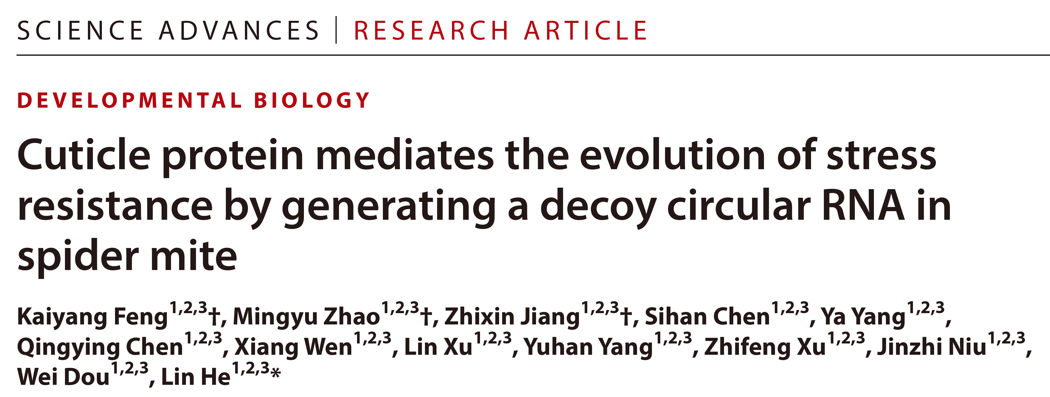 近日,beat365在线唯一官网登录何林教授团队在Science子刊Science Advances上在线发表了题为“Cuticle protein mediates the evolution of stress resistance by generating a decoy circular RNA in spider mite”(译:朱砂叶螨表皮增厚介导抗逆性进化的诱饵RNA机制)的研究论文,首次发现并系统阐明了朱砂叶螨表皮发育增厚会导致其对多种杀螨剂产生广谱的交互抗性,表皮蛋白可通过释放“诱饵”RNA拮抗并抑制miRNA簇的功能,从而调控自身过表达,最终导致朱砂叶螨表皮发育增厚,促进其抗逆性进化的分子新机制。