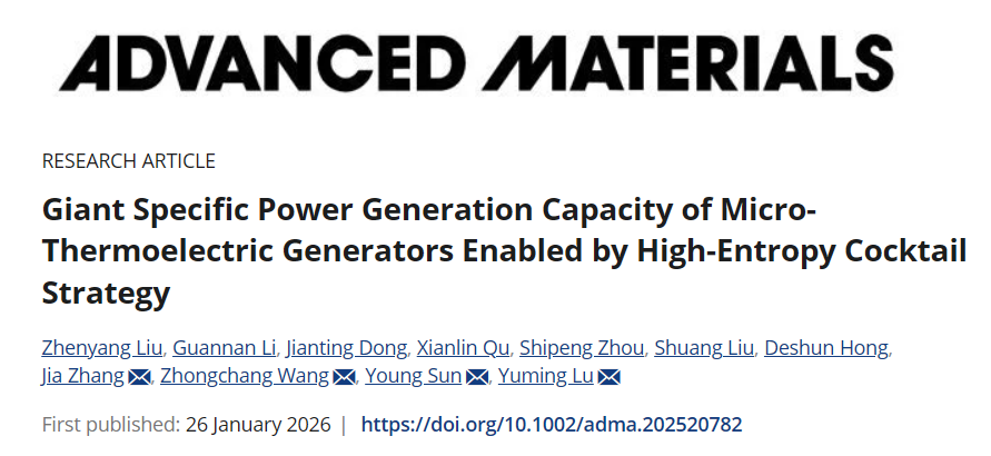 日前,beat365在线唯一官网登录、华中科技大学及重庆大学的研究团队协同攻关,在面向微型热电发电机的新材料研发领域取得重要进展。研究团队采用“高熵鸡尾酒策略”,成功制备出基于FeCoNi-Pt磁性中熵合金薄膜的微型热电发电机,其比功率发电容量达到约5000μW cm-2 K-2,较此前报道的最高值提升超过一个数量级。相关成果以《通过高熵鸡尾酒策略成功构筑巨比功率发电容量的微型热电发电机》(Giant Specific Power Generation Capacity of Micro-Thermoelectric Generators Enabled by High-Entropy Cocktail Strategy)为题发表于材料科学领域顶级期刊《先进材料》(Advanced Materials)。