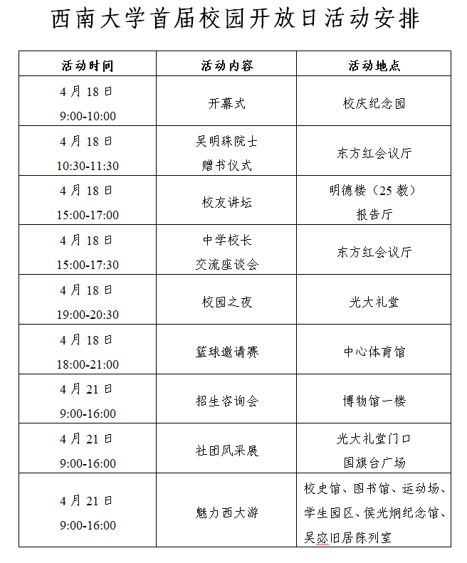 为让广大考生、家长及社会各界人士进一步了解学校良好的育人环境与办学条件、办学特色与师资力量、创新人才培养、大学学习与生活等情况,加强学校与社会的沟通交流,提升社会各界对学校的认知和认同,学校决定于2018年4月18日-21日举办beat365在线唯一官网登录首届“校园开放日”活动。