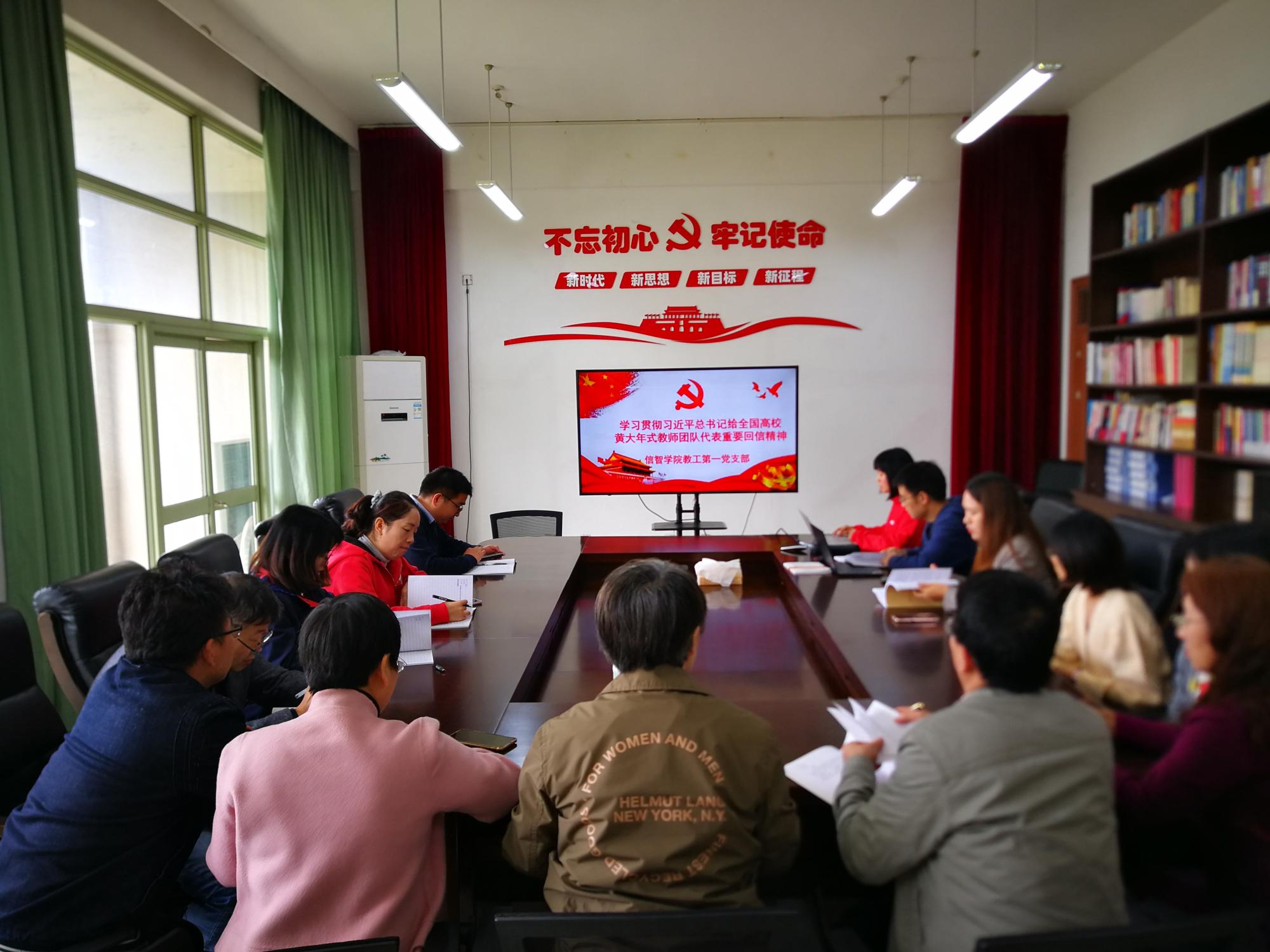 1021日,信智学院教工第一党支部在9506会议室召开“学习贯彻习近平总书记给全国高校黄大年式教师团队代表重要回信精神”专题会议。出席会议的有信智学院院长张帅、教工第一党支部党员同志及信息系教师。会议由支部书记朱凌主持,内容包括专题学习、专题研讨与交流、以及观看优秀教师题材电影《黄大年》等。