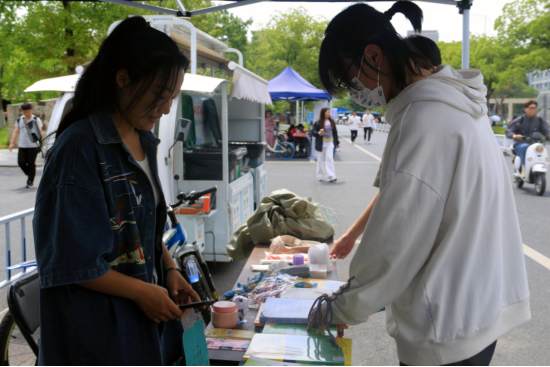 之后于5月16日在学校文化长廊进行摆摊义卖,由园区工作站成员和部分班级班委共同管理摊位,义卖期间支持全校师生用现金、支付宝、微信等方式购买物品或捐赠闲置物品。