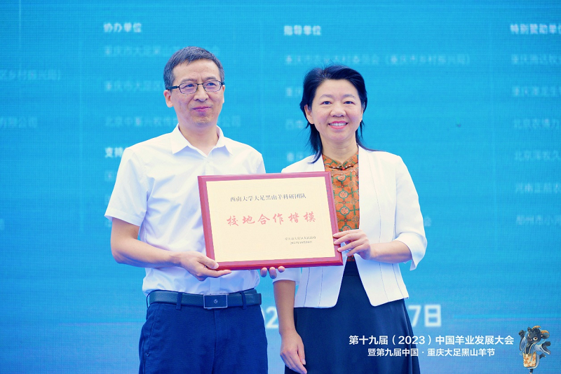 10月16日,第十九届(2023)中国羊业发展大会暨第九届中国·重庆大足黑山羊节在重庆大足举行。会上,为表彰学校大足黑山羊专家团队为重庆市大足区黑山羊产业高质量发展作出的突出贡献,大足区人民政府授予该团队“校地合作楷模”称号,并为学校张家骅教授颁发“大足黑山羊终身荣誉首席专家”证书,为李周权、王豪举和徐恢仲3位专家颁发“大足黑山羊终身荣誉特聘专家”证书,为赵中权教授颁发“大足黑山羊首席专家”聘书。