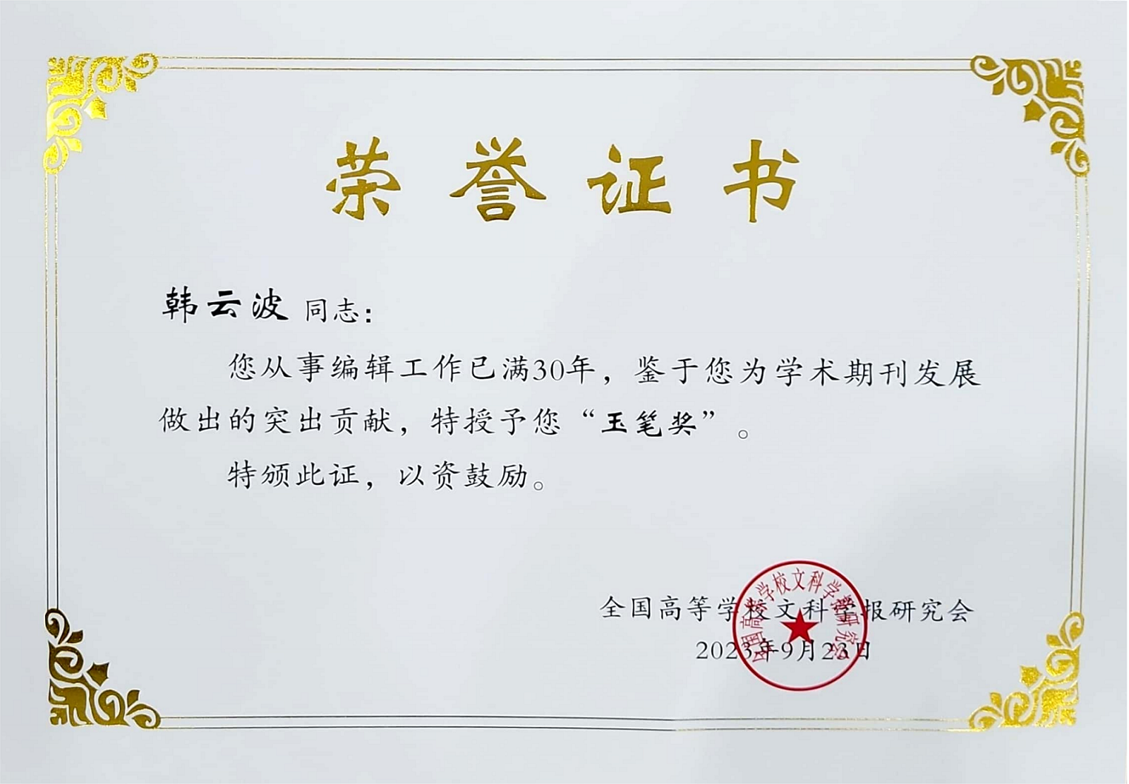 此次期刊质量检查与评估由26名总评委按照大区分成4个评审组和1个审核组,对各省市研究会推荐的433家期刊进行严格评估,最终评出“全国高校权威社科期刊”95家、“全国高校精品社科期刊”120家、“全国高校优秀社科期刊”142家、“全国高校质量进步期刊”62家。此外,已从事编辑工作30年的学报编辑部主任韩云波编审荣获“玉笔奖”。