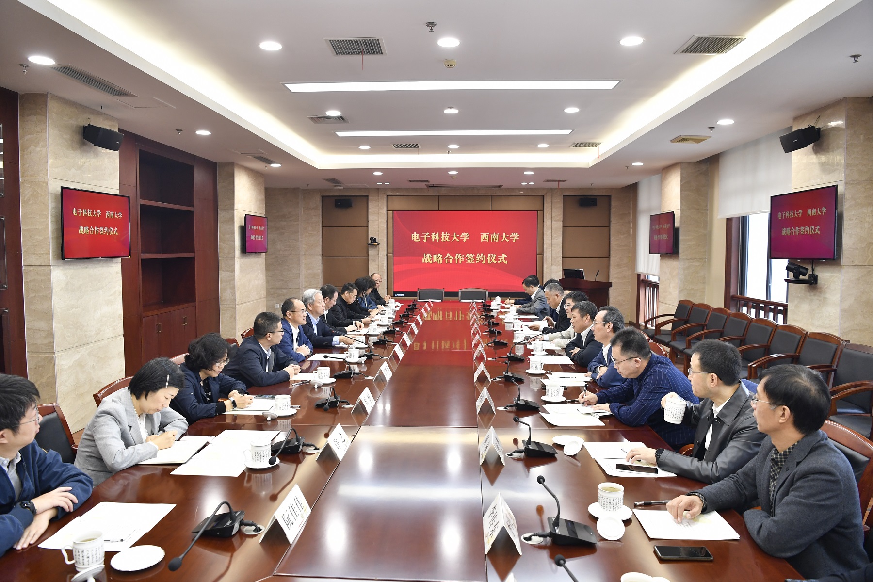 为加快世界一流大学和一流学科建设,有力支撑国家创新体系和成渝地区双城经济圈建设,10月23日,学校党委书记李旭锋,校长张卫国,副校长王志坚、葛信勇带队前往电子科技大学签署两校战略合作框架协议,并开展调研交流。电子科技大学党委书记王亚非,校长曾勇,副校长胡俊、罗光春出席签约仪式。