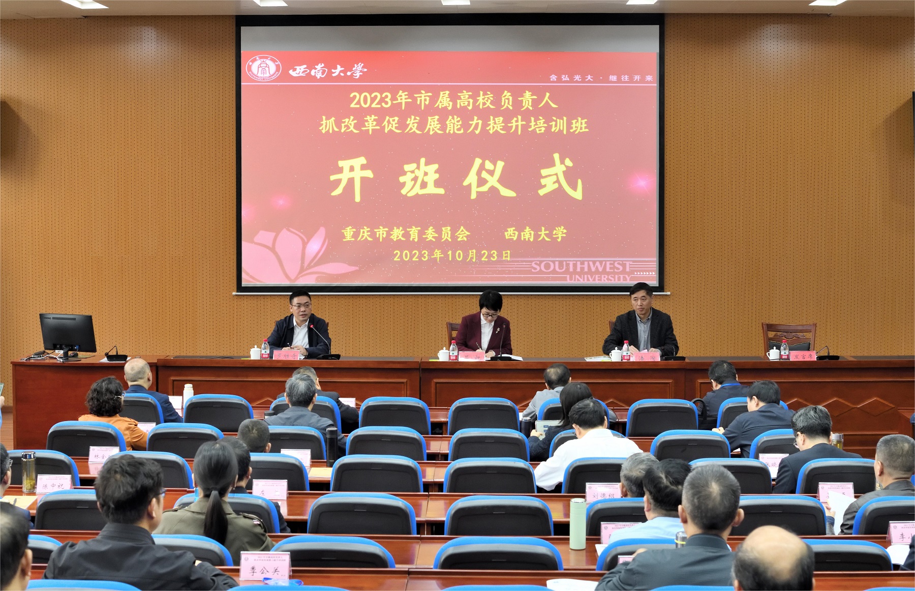 10月23日上午,重庆市属高校负责人抓改革促发展能力提升培训班在学校开班。市委教育工委专职副书记屈锐、beat365在线唯一官网登录党委副书记潘洵出席开班仪式,开班仪式由市委教育工作领导小组秘书组秘书处处长罗胜奇主持。