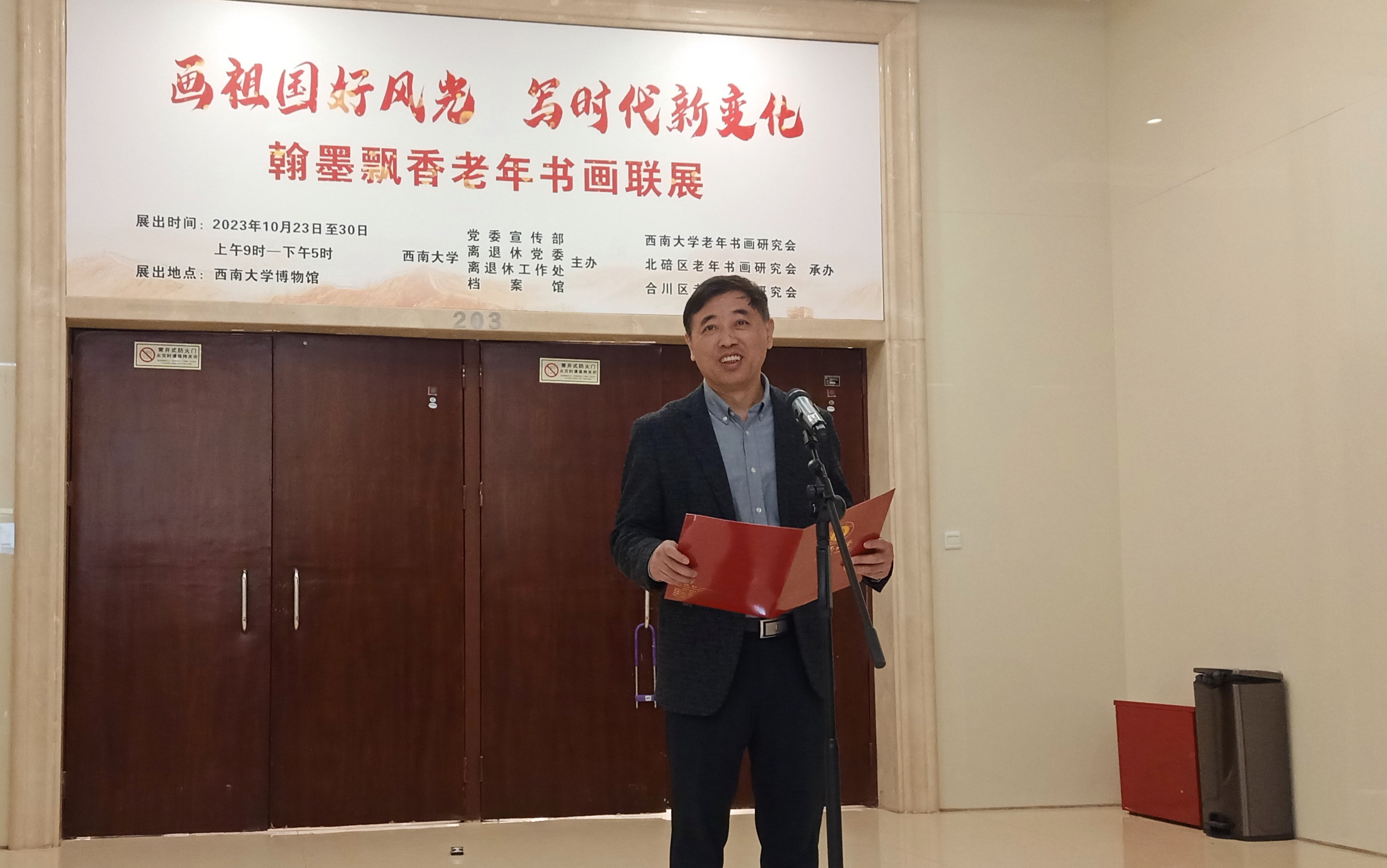 为欢庆2023年老年节,“画祖国好风光 写时代新变化”老年书画作品联展于10月23日在学校博物馆开幕,展览由学校党委宣传部 党委网络工作部,离退休党委、离退休工作处,档案馆、校史馆、博物馆主办,学校、北碚区、合川区老年书画研究会承办。学校党委副书记潘洵出席开幕式并讲话,离退休党委党委书记李红主持开幕式。相关职能部门、学院领导,学校、北碚区、合川区老年书画研究会负责人、会员及师生代表共60余人参加开幕式。