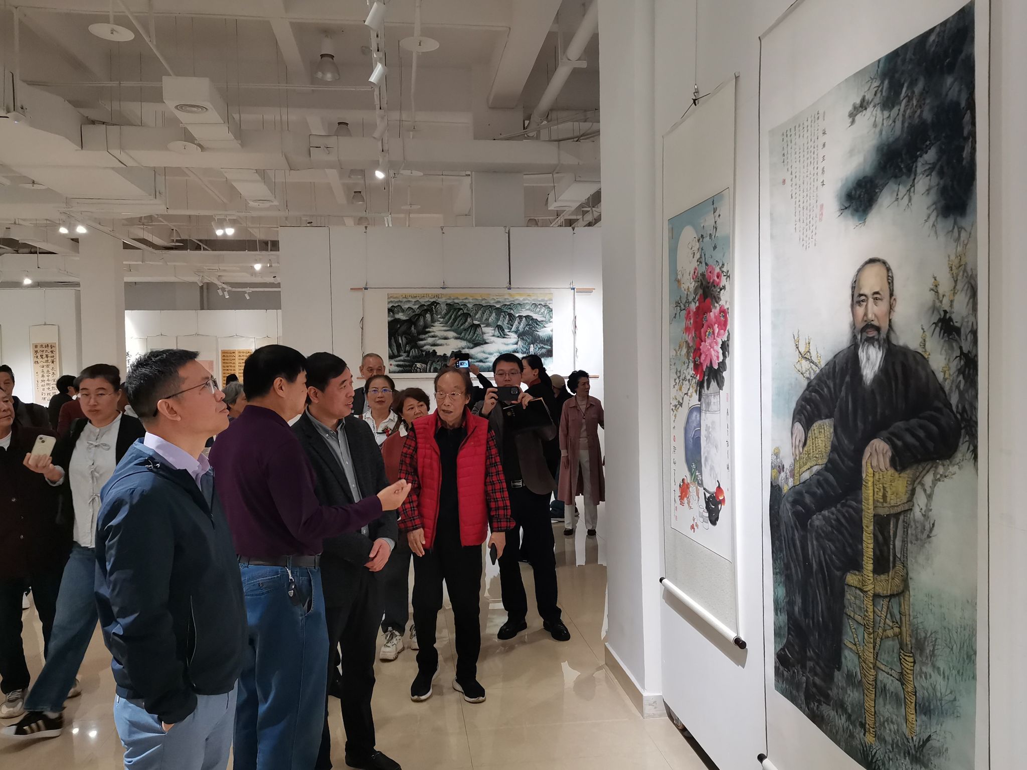 开幕式后,与会嘉宾一同观赏书法、绘画作品。此次联展共展出不同风格、不同类型、不同题材的书法、绘画作品220余幅,其中有气势磅礴的宏篇巨作,也有抒情写意的小件作品,这些作品倾注了老同志们对党的无限热爱,对祖国的一片深情,展示了老同志们与时俱进的精神。