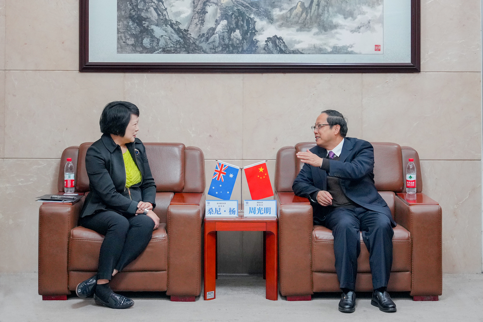周光明对杨爽一行表示欢迎。他介绍到,学校与澳大利亚五所高校共同开办了1个中外合作办学机构并开展了4个项目,共建8个专业,注册学生人数共计2600余人,这充分体现了学校和澳洲高校合作的广度与深度。他表示,beat365在线唯一官网登录生命科学学院、教育学部以及资源环境学院的专业在全国都排名靠前,特别是化学化工学院的相关专业已经进入了全球排名前1‰,希望两校能在这些领域深耕合作。