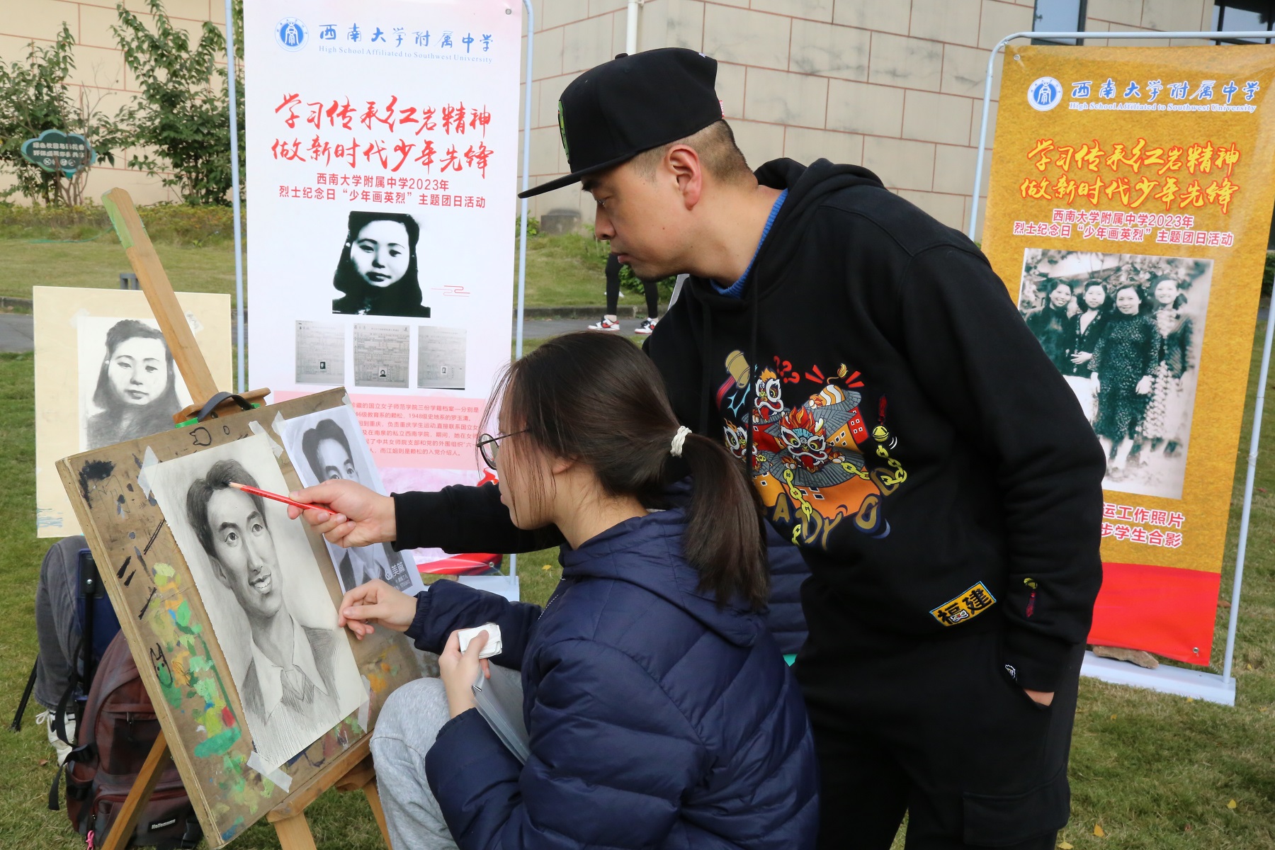 校史馆前的草坪上,郑劲松老师给同学们上了一堂生动的思政教育实践课,学生们聆听着著名英烈江姐当年联系国立女子师范学院的事迹,赞叹着陈诗伯、张泽浩等红岩烈士的革命英雄主义精神,学英雄,画英雄,追念英雄,致敬英雄。美创班的学生们架好画板,拿出画笔,满怀敬畏之心,临摹先烈肖像。学生会成员写下自己参加此次活动的感悟。孩子们的笔触满怀深情,“下笔春蚕食叶声”,一笔一划激起了我们灵魂深处的一次次感动。