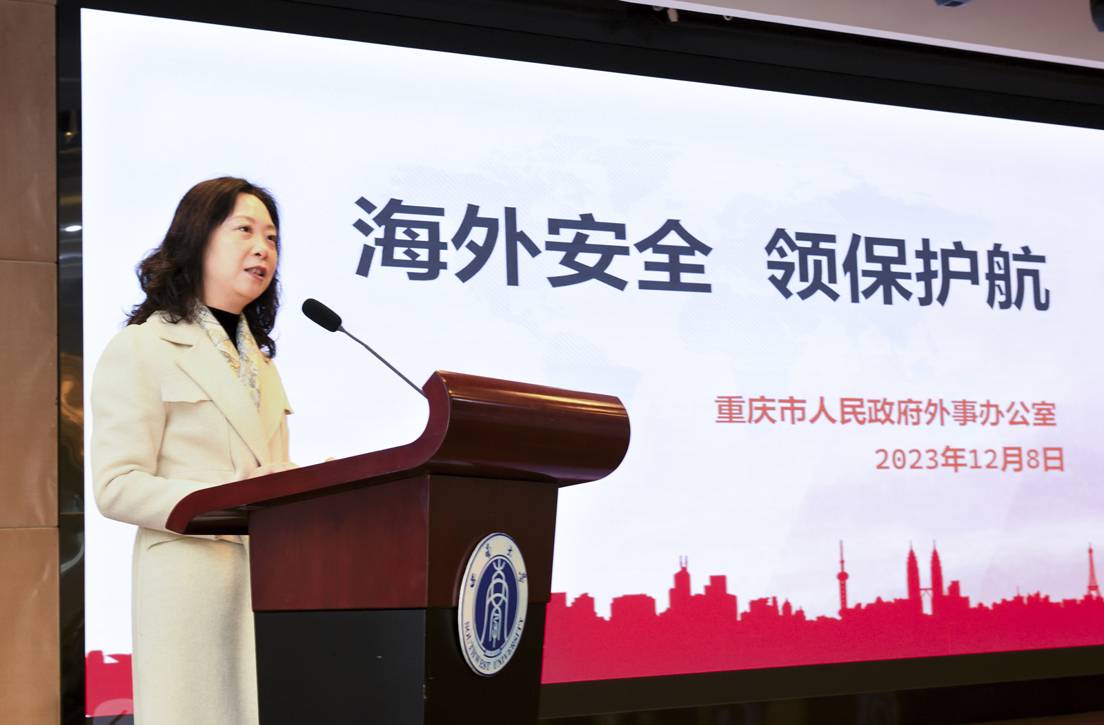 本次培训会结合学校留学师生需求,特邀相关领域专家为留学人员提供丰富实用的专题讲座,内容涵盖海外安全与领事保护、跨文化交流、弘扬科学家精神、传承留学报国传统等方面。重庆市人民政府外事办公室涉外管理处处长杨瑜,四川外国语大学段俊晖教授等应邀作专题报告。