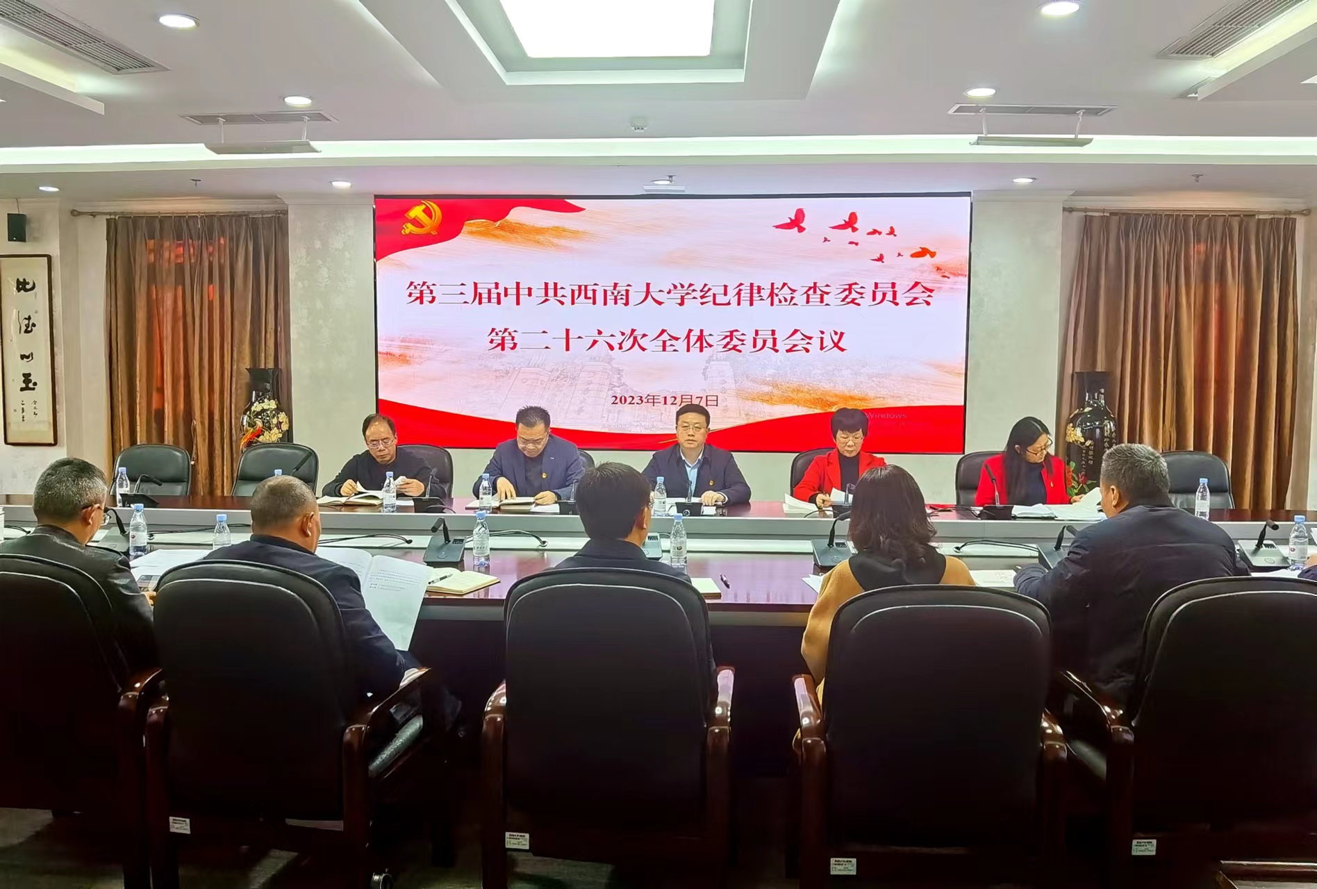 12月7日下午,第三届中共beat365在线唯一官网登录纪律检查委员会第二十六次全体会议召开,传达学习上级会议文件精神,通报研究有关工作。学校党委副书记、纪委书记夏玉峰主持会议,纪委委员参加会议,纪委办监察处巡察办副处级以上干部列席会议。
