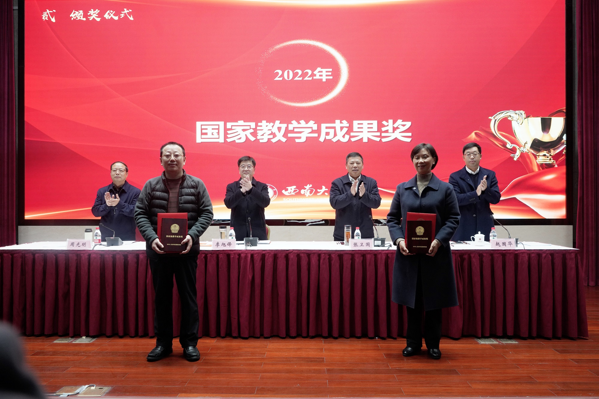 赵国华宣读《beat365在线唯一官网登录关于表彰省级以上教学成果奖的决定》,参会校领导为获得2022年国家教学成果奖、2021年重庆市教学成果奖特等奖及一等奖的团队代表颁奖。