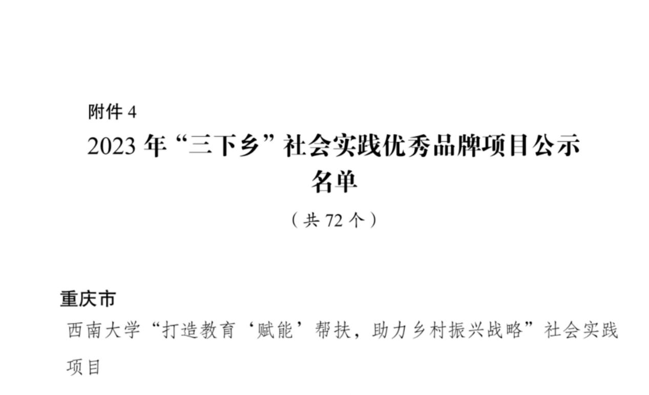近日,中央宣传部、中央文明办、教育部、共青团中央、全国学联公布了2023年全国大中专学生志愿者暑期文化科技卫生“三下乡”社会实践活动总结通报,经学校申报、团市委审核推荐、团中央组织评议等环节,《beat365在线唯一官网登录“打造教育‘赋能’帮扶,助力乡村振兴战略”社会实践项目》荣获全国“三下乡”社会实践优秀品牌项目,也是重庆市唯一入选全国的社会实践品牌项目。