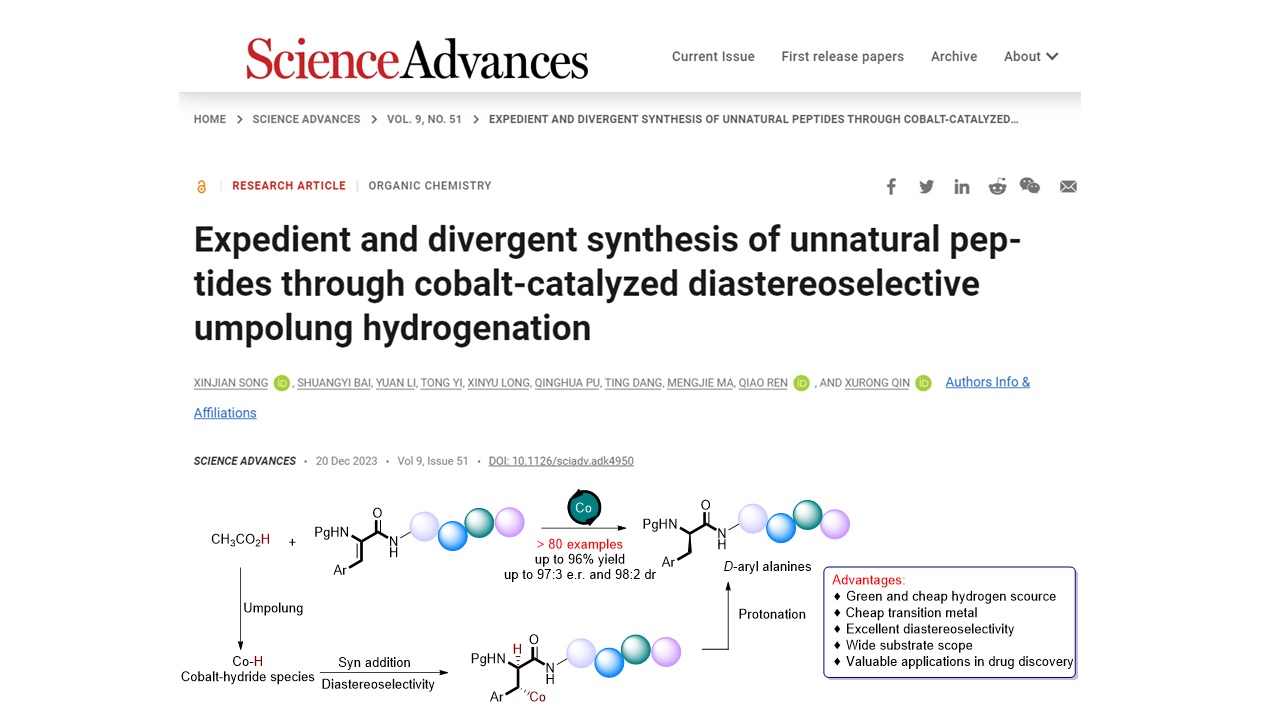 近日,药学院中医药学院秦绪荣教授、任巧副教授研究团队以廉价的过渡金属钴盐为催化剂成功地以高产率和高非对映选择性构建了非天然芳基丙氨酸多肽分子库。该反应采用了极性反转策略,利用醋酸和甲醇作为氢源,避免了危险高压氢气的使用。同时,此策略省去了预先合成非天然芳基丙氨酸的冗长步骤;并且产物不会发生外消旋化或差向异构化。相关研究成果发表在国际知名期刊《Science》子刊《Science Advances》上,题为《钴催化非对映选择性氢化合成非天然芳基丙氨酸多肽》(“Expedient and divergent synthesis of unnatural peptides through cobalt-catalyzed diastereoselective umpolung hydrogenation”)(https://www.science.org/doi/10.1126/sciadv.adk4950)。