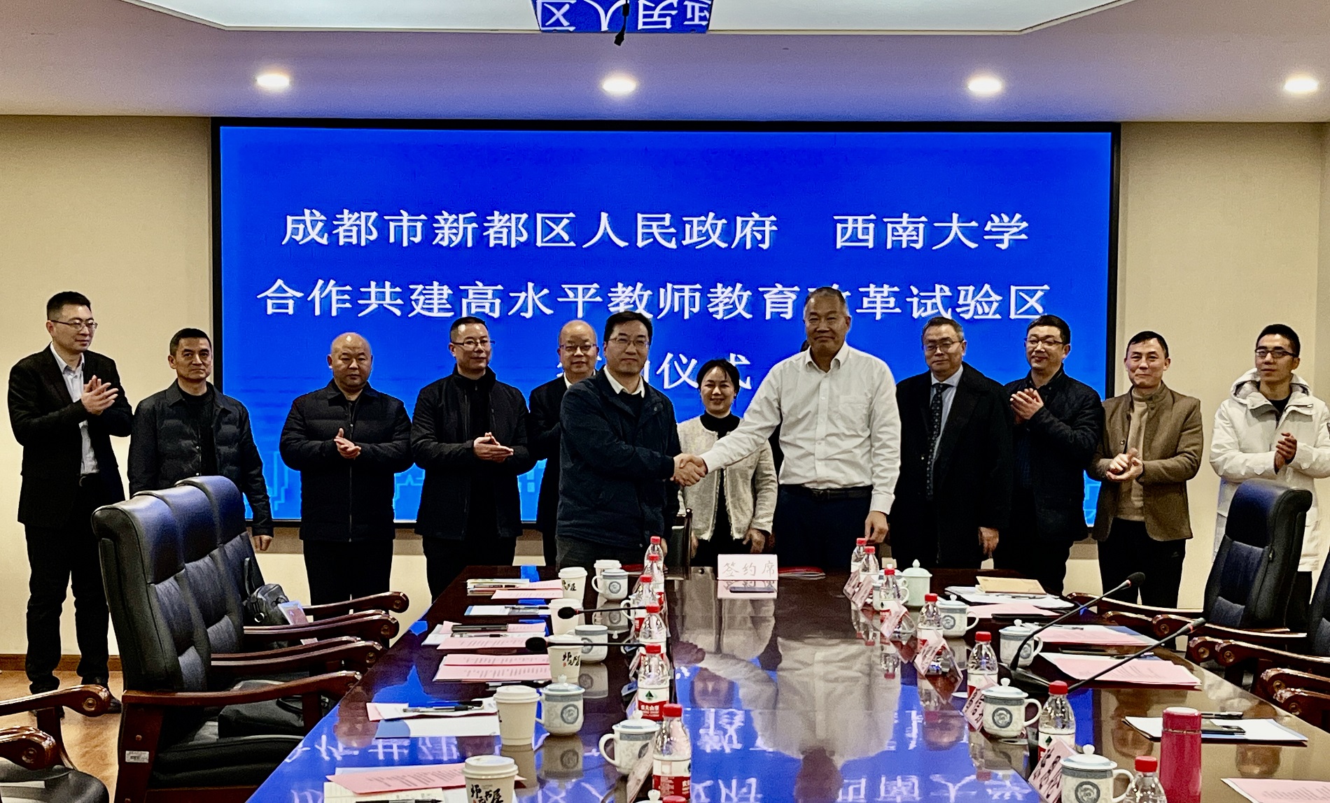 葛信勇和成都市新都区副区长贺凯丰代表双方单位签订合作协议。签约仪式后,双方就高质量教师教育改革发展以及基础教育和高等教育进一步融合具体举措开展座谈。