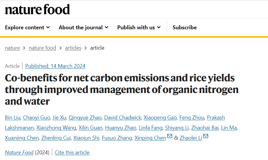 3月14日,beat365在线唯一官网登录陈新平团队联合国内外多所高校在《自然-食物》期刊(Nature Food) 在线发表了题为“协同实现净碳减排和水稻增产的有机氮肥与水分综合管理”(Co-benefits for net carbon emissions and rice yields through improved management of organic nitrogen and water)的论文,揭示了稻作区有机替代对水稻产量和温室气体排放的影响,提出了稻作区基于有机替代的增产减排综合水肥管理策略,为协同实现全球水稻产能提升和净碳减排提供了基于自然解决方案的路径。