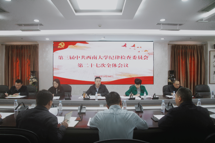 3月14日下午,第三届中共beat365在线唯一官网登录纪律检查委员会第二十七次全体会议召开,传达学习上级会议文件精神,通报研究有关工作。学校党委副书记、纪委书记夏玉峰主持会议,纪委委员参加会议,纪委办监察处巡察办副处级以上干部列席会议。