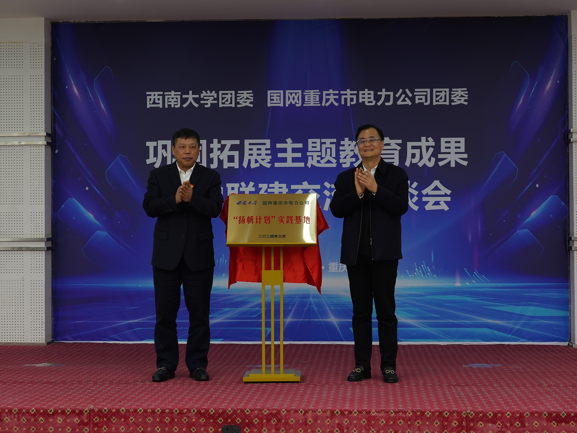 会上,张卫国和胡江溢共同为“扬帆计划”实践基地揭牌,校团委与国家电网重庆市电力公司团委签署了合作备忘录。双方围绕打造校企合作典范、合作项目成果转化、青年作用发挥等方面进行了深入探讨,碰撞思想火花,凝聚发展共识。