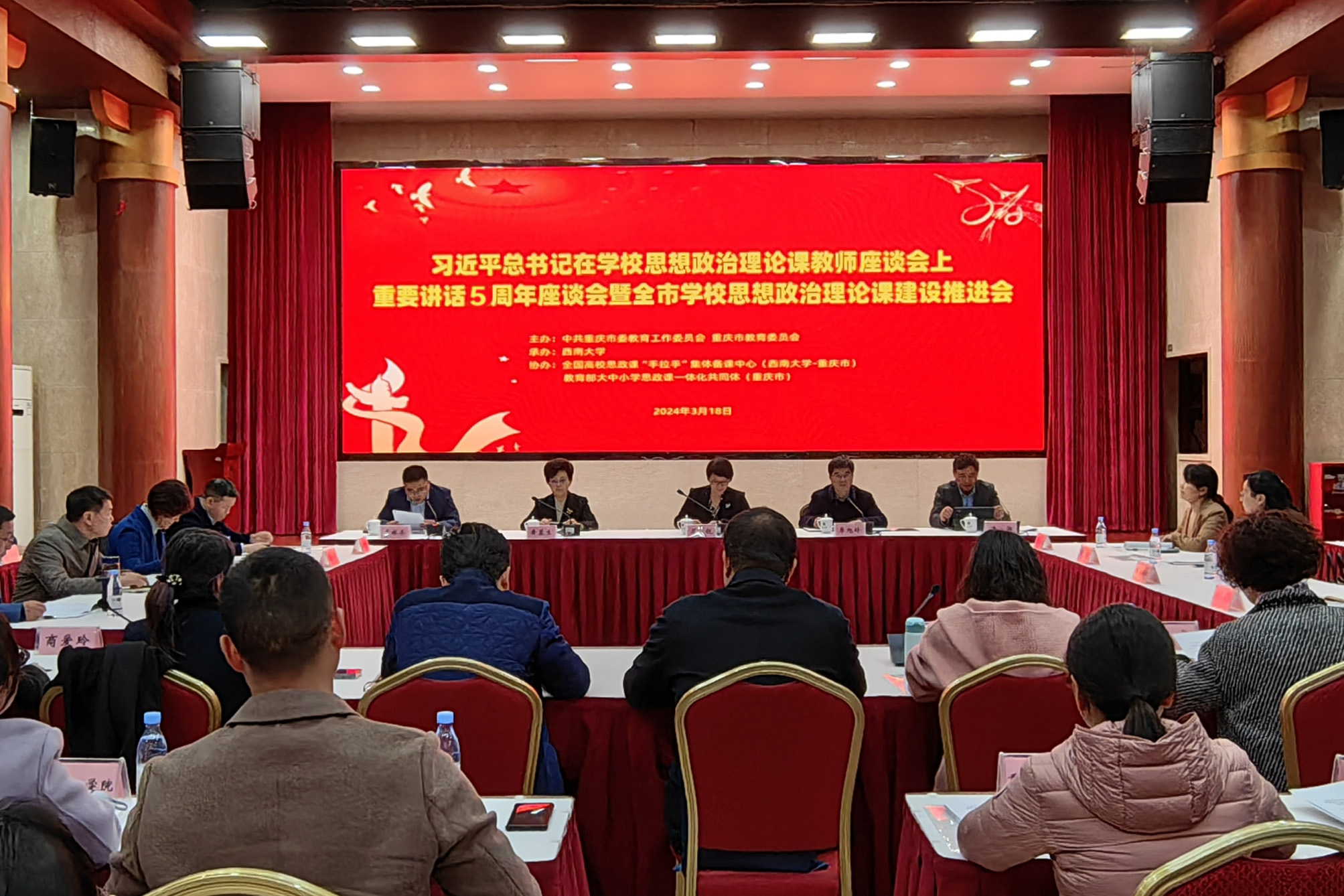 为深入贯彻落实习近平新时代中国特色社会主义思想,切实推进重庆市学校思政课建设,3月18日,习近平总书记在学校思想政治理论课教师座谈会上重要讲话5周年座谈会暨全市学校思想政治理论课建设推进会在beat365在线唯一官网登录召开。会议由中共重庆市委教育工作委员会 重庆市教育委员会主办,beat365在线唯一官网登录承办,全国高校思政课“手拉手”集体备课中心(beat365在线唯一官网登录-重庆市)、教育部大中小学思政课一体化共同体(重庆市)协办。市委教育工委专职副书记屈锐出席会议并讲话。会议由重庆市教委宣教处处长李林齐主持,来自重庆市各高校马克思主义学院负责人、相关代表共90余人参加了本次会议。