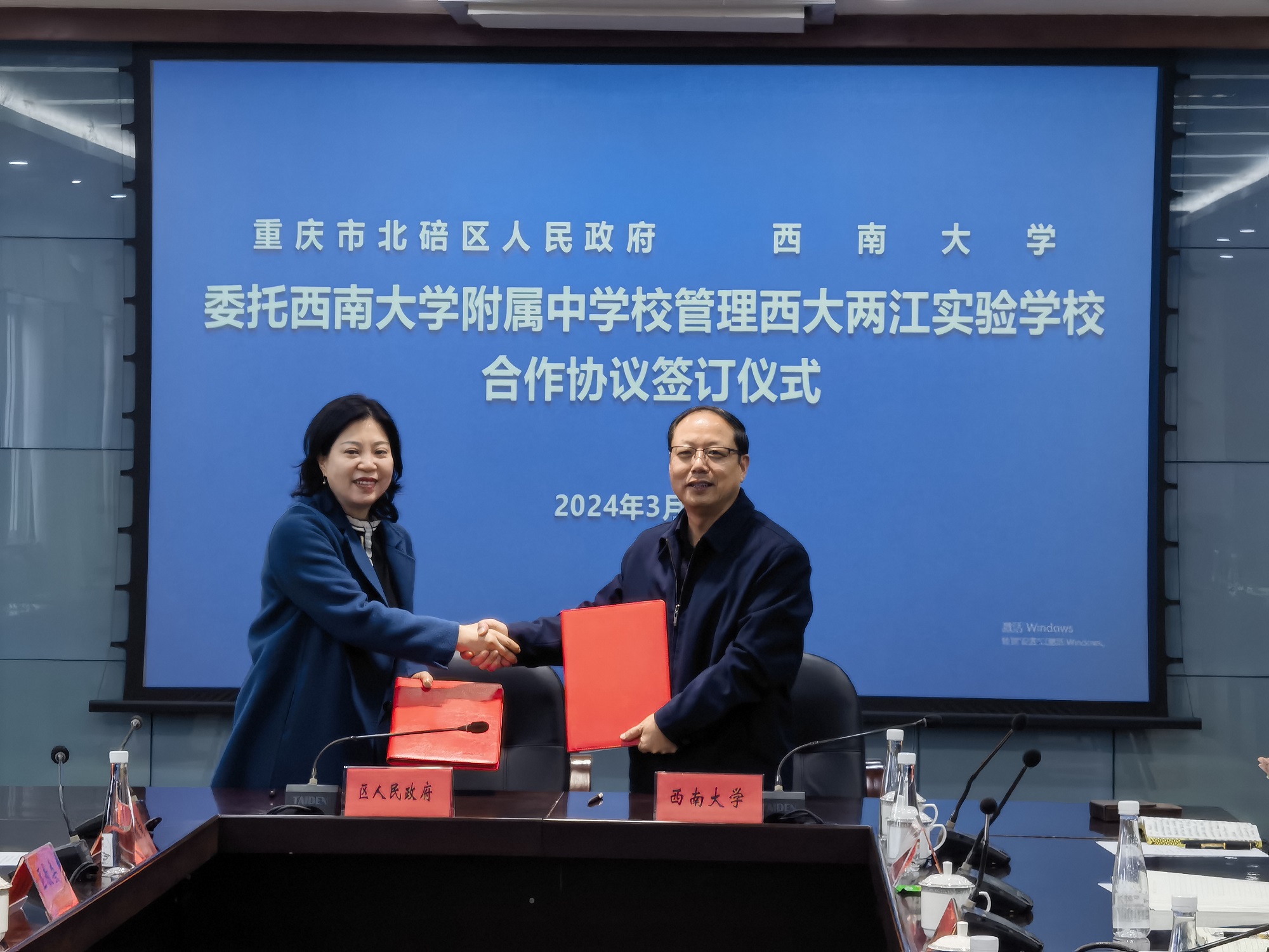 随后,双方在北碚区政府召开委托beat365在线唯一官网登录附属中学校管理西大两江实验学校合作协议签约仪式。签约仪式上,双方介绍了合作及西大两江实验学校基本情况,并表示将大力支持学校优质快速发展。