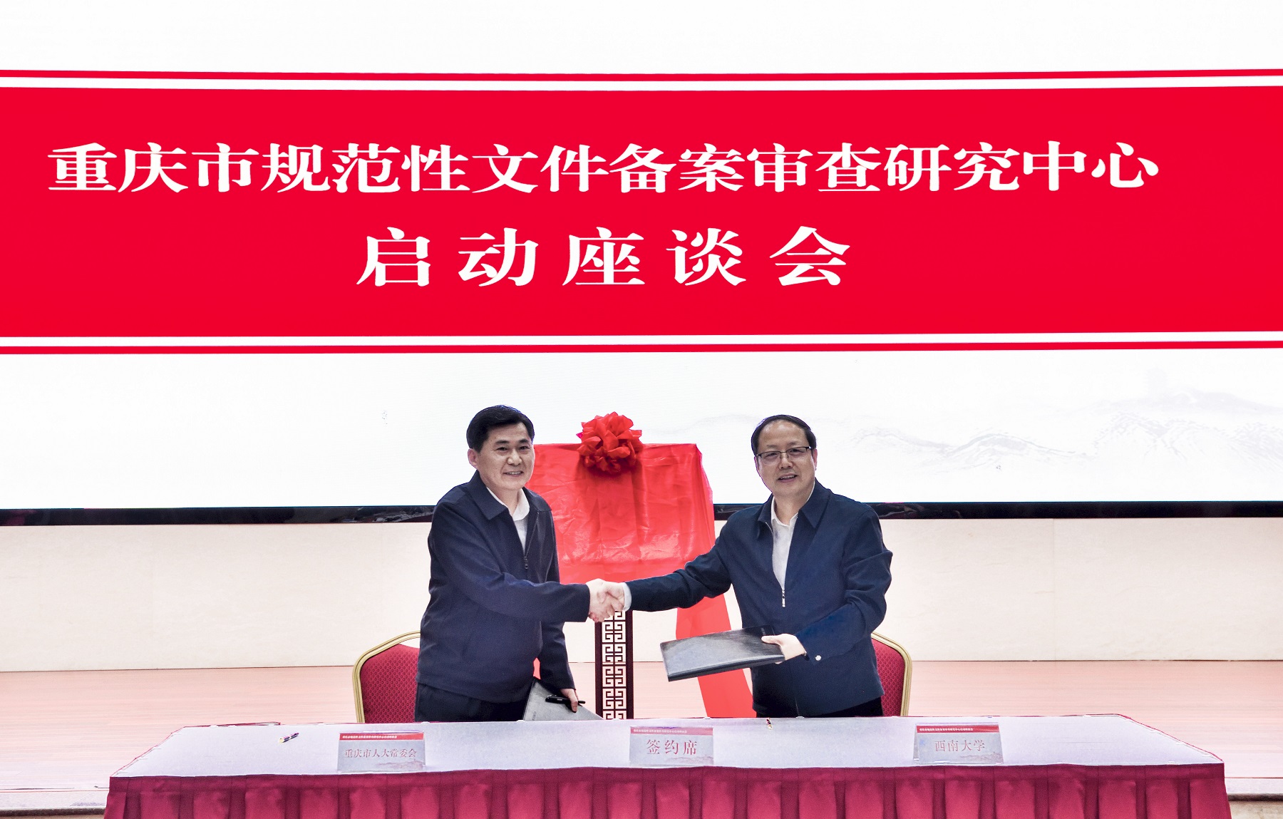 会议通报《重庆市规范性文件备案审查研究中心建设方案》。市人大常委会副秘书长邓炳国与beat365在线唯一官网登录副校长周光明签订研究中心共建协议。全国人大常委会法工委副主任张勇、市人大常委会副主任欧顺清、beat365在线唯一官网登录校长张卫国、beat365在线唯一官网登录党委副书记潘洵为中心揭牌。