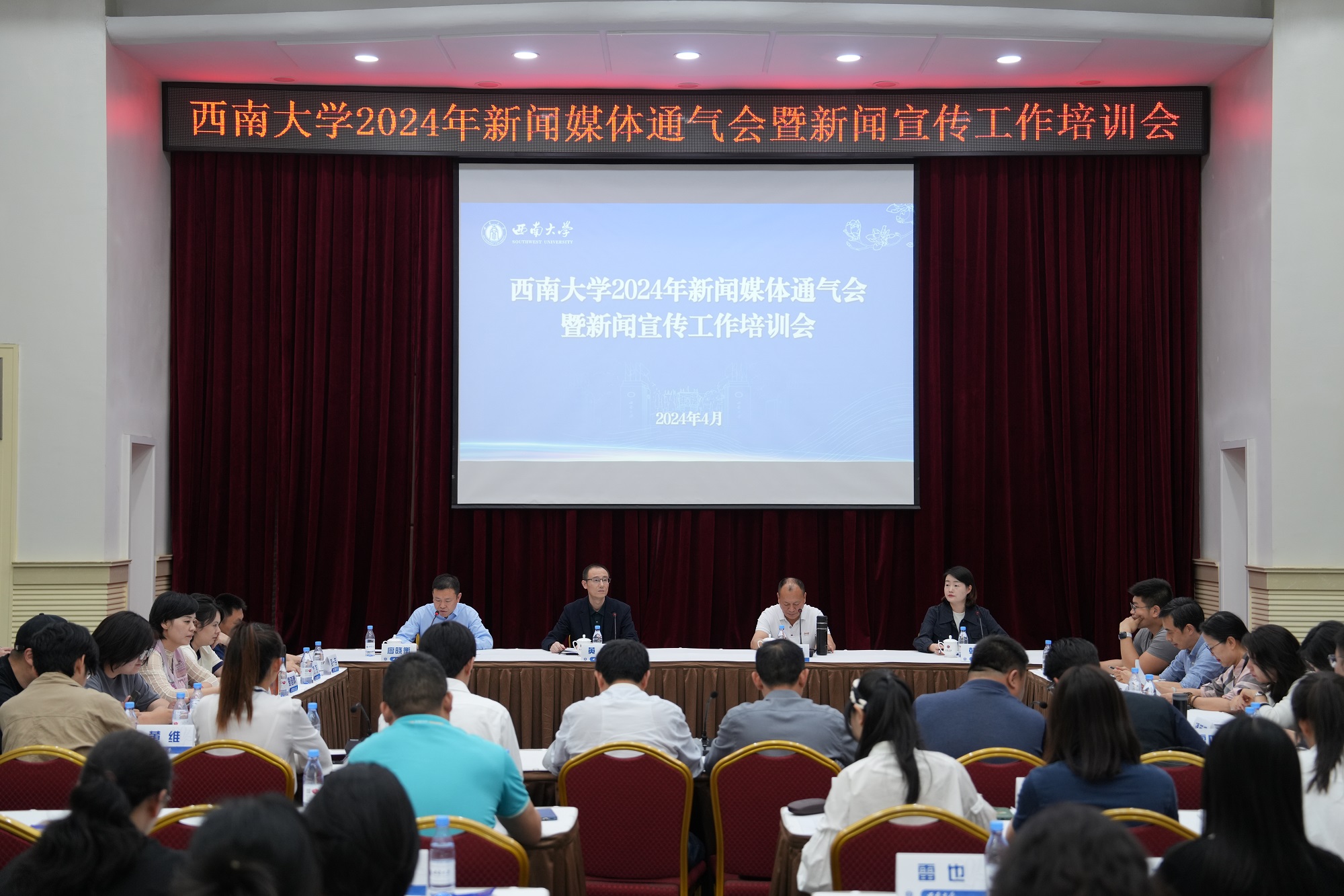 4月18日下午,学校在桂园宾馆金桂厅举办2024年新闻媒体通气会暨新闻宣传工作培训会。党委副书记黄杰出席会议,人民日报、新华通讯社、光明日报、重庆日报、重庆广播电视集团(总台)等20余家媒体记者代表到会指导交流,部分二级单位有关负责人、各二级单位新闻通讯员、全体校级新闻阅评员参加会议。会议由党委宣传部、党委网络工作部部长廖晓衡主持。