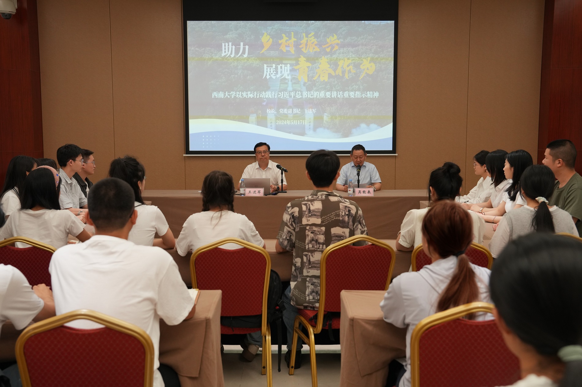 第一阶段,王进军以《助力乡村振兴展现青春作为》为题讲授思政课,指出要深刻领会把握习近平总书记对重庆工作成绩的肯定勉励、赋予重庆新的时代使命和战略定位、对重庆高质量发展明确的重大任务、对谱写西部大开发新篇章作出的重大部署和对加强党的建设提出的新指示新要求,勉励同学们强化在新时代西部大开发和乡村全面振兴中的担当作为,将个人发展“小目标”融入党和国家事业的“大蓝图”,在伟大实践中不负重托、不辱使命、不懈奋斗。