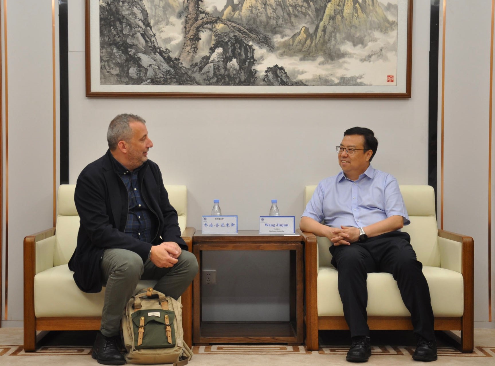 王进军对乔治·齐亚米斯的来访表示热烈欢迎,简要介绍了学校人才培养、学科特色及中希文明互鉴中心建设情况。他希望两校依托现有合作基础,加强战略沟通,深化学生培养与学术研究合作,持续推动两校关系健康发展。