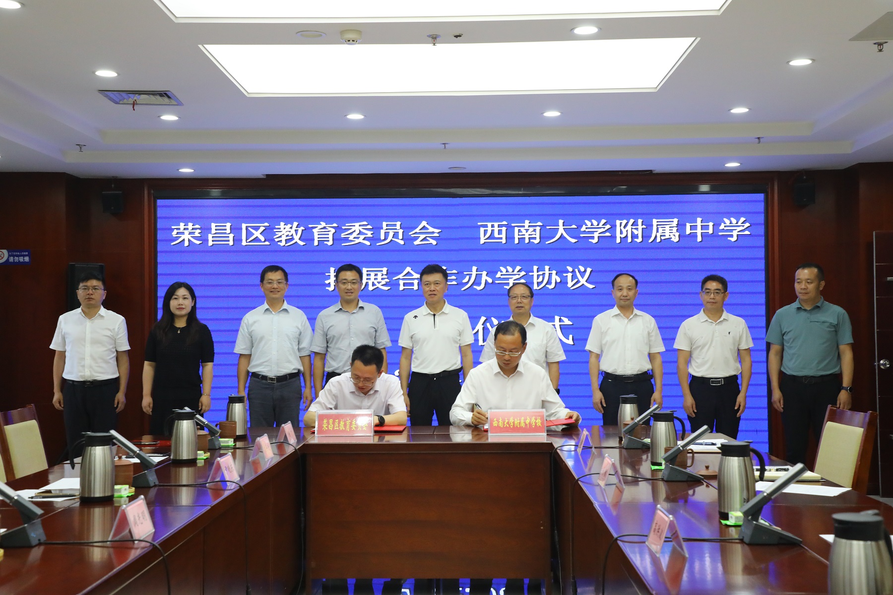 调研结束后,附属中学与荣昌区教委拓展合作办学签约仪式在荣昌区政府举行。荣昌区委书记高洪波、区人民政府副区长李德伟、区政协副主席赵敏、beat365在线唯一官网登录副校长周光明出席签约仪式,荣昌区委教育工委书记、区教委主任黄勇和附属中学党委书记欧健代表双方签订办学合作协议,荣昌区教委、培训与基础教育管理处、附属中学相关负责人见证签约。