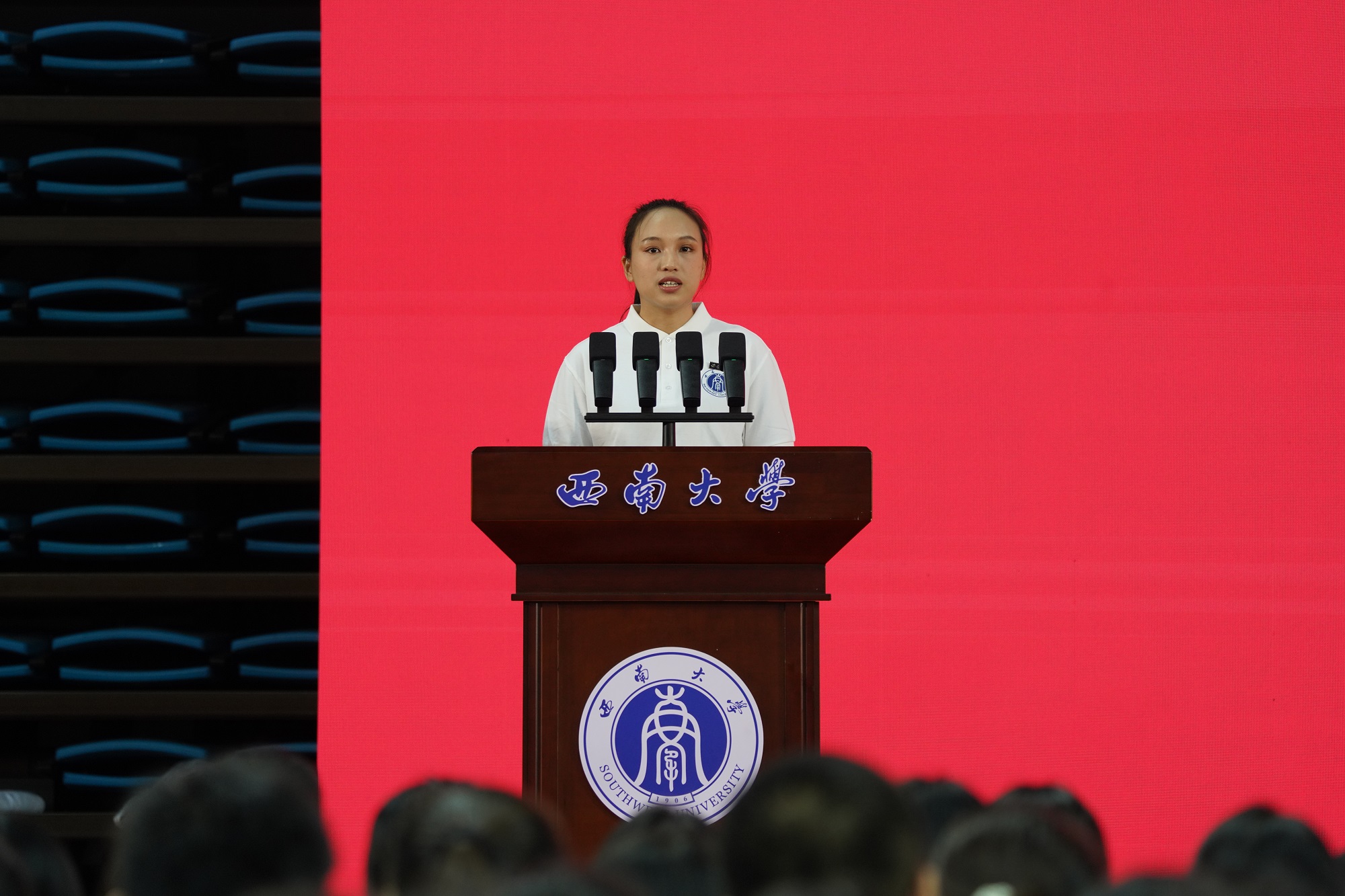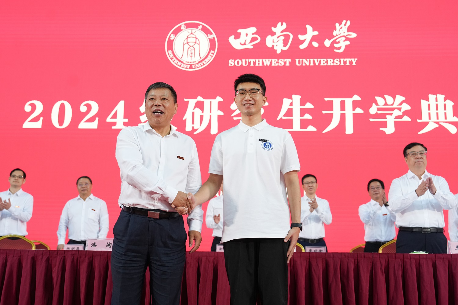 典礼还举行了佩戴校徽仪式。党委书记张卫国为新生代表佩戴beat365在线唯一官网登录徽章。希望2024级全体研究生秉承“含弘光大、继往开来”的校训和“特立西南、学行天下”的大学精神,薪火相传、不懈奋斗,续写属于新一代西大人的崭新篇章。
