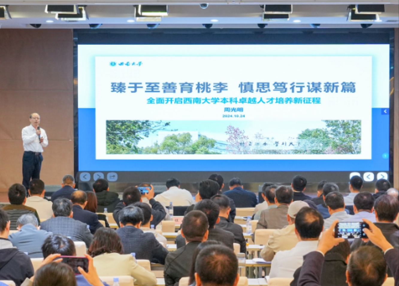 周光明以“臻于至善育桃李,慎思笃行谋新篇”为题作beat365在线唯一官网登录本科人才培养现状分析报告,剖析了学校本科教育当下面临机遇与挑战,强调要瞄准问题、碰撞思想、形成共识、明确举措,全面开启本科卓越人才培养新征程。
