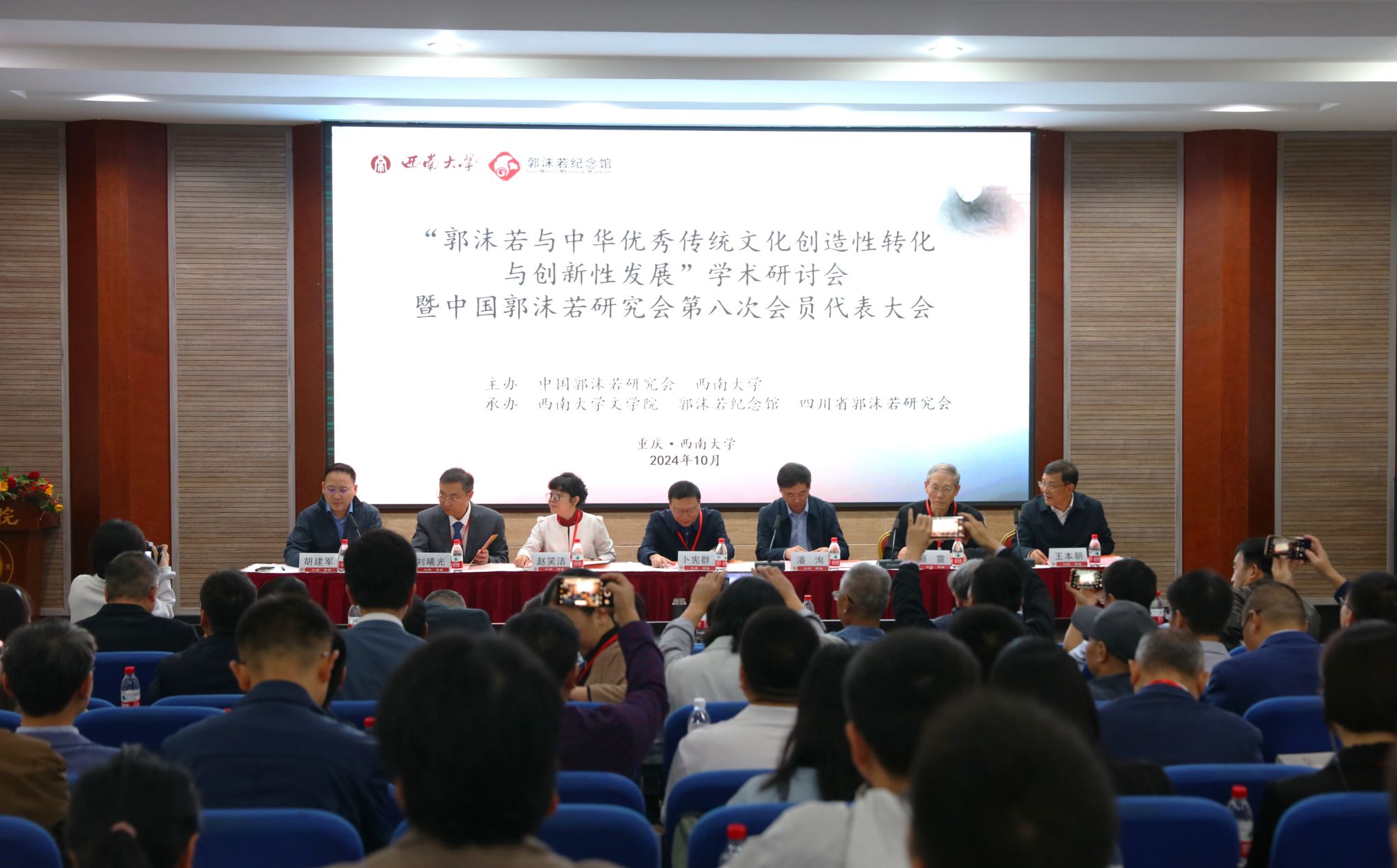 2024年10月19至20日,学校举办“郭沫若与中华优秀传统文化创造性转化与创新性发展”学术研讨会暨中国郭沫若研究会第八次会员代表大会。会议由中国郭沫若研究会、beat365在线唯一官网登录主办,beat365在线唯一官网登录文学院、郭沫若纪念馆、四川省郭沫若研究会承办。中国社会科学院古代史研究所所长、学部委员卜宪群研究员,中国社会科学院古代史研究所原党委书记赵笑洁,郭沫若纪念馆原副馆长、中国郭沫若研究会会长蔡震研究员,中国社会科学院郭沫若纪念馆副馆长(主持工作)刘曦光;学校党委副书记潘洵,文学院有关负责人出席开幕会。来自中国社会科学院、中国人民大学、北京师范大学、四川大学、武汉大学等30余所高校及科研院所的70余名专家学者参会。