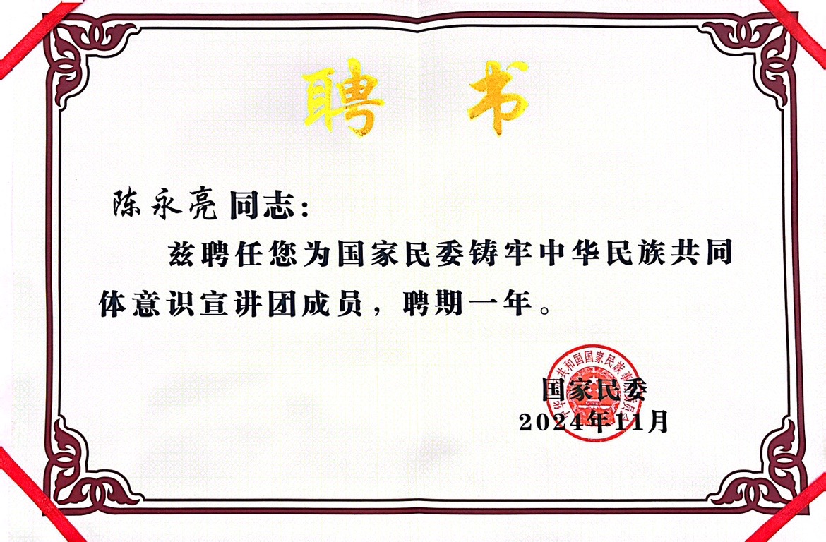据悉,陈永亮长期致力于马克思主义民族理论与政策、中华民族共同体研究,在铸牢中华民族共同体意识研究方面成果丰硕,曾荣获国家民委信息工作先进个人以及国家民委社会科学研究成果奖二等奖、三等奖等。