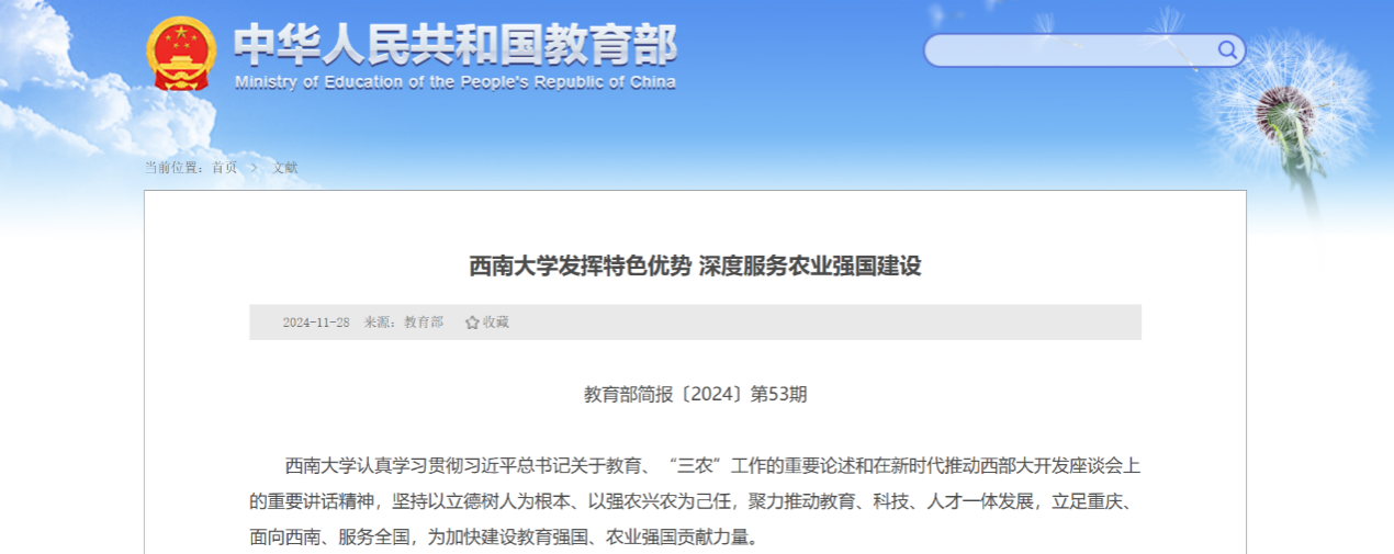 近日,学校发挥特色优势,深度服务农业强国建设工作受到《教育部简报》单篇报道,相关内容由国内合作处、党政办公室报送。报道原文如下: