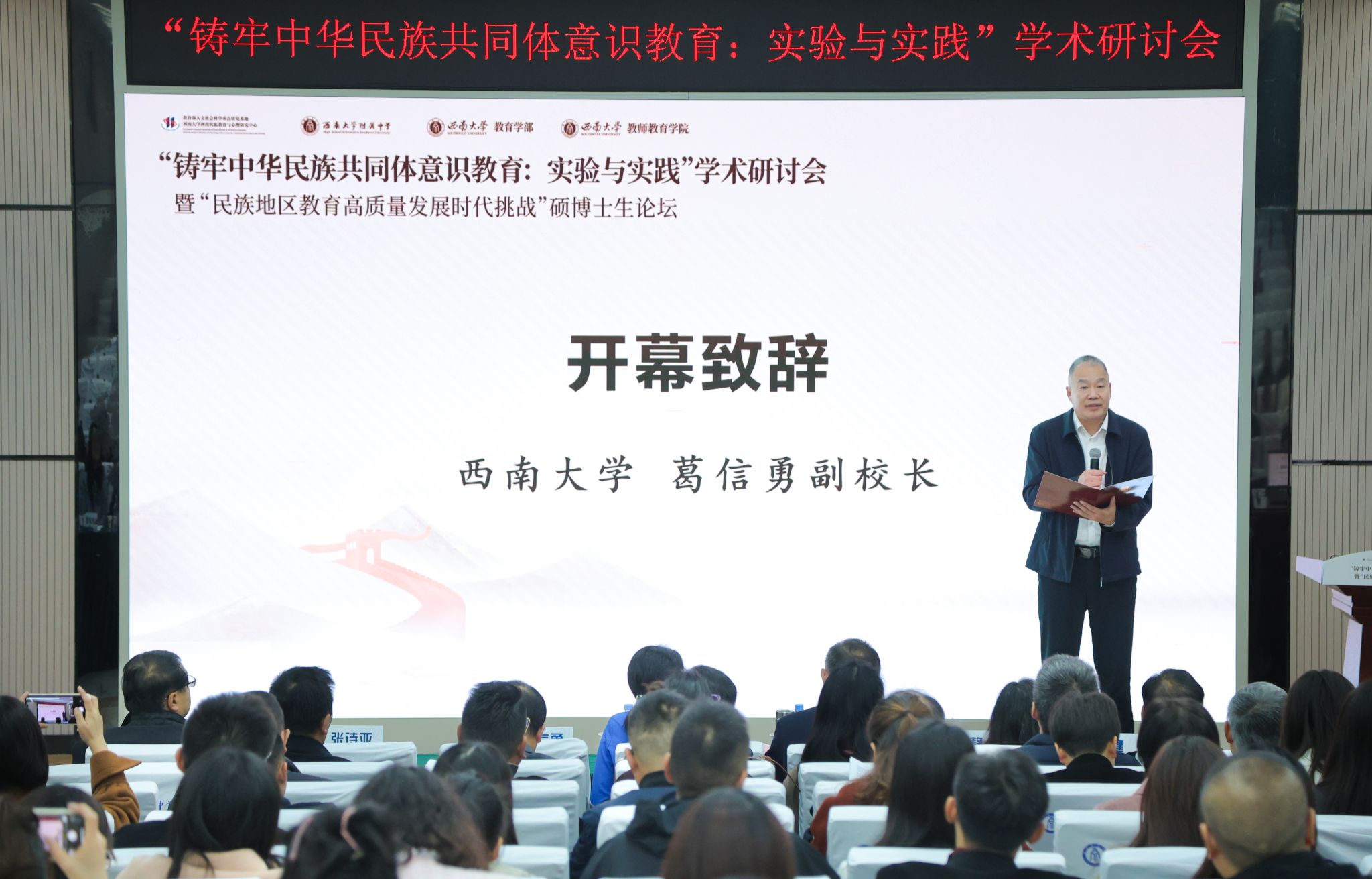 11月23日至24日,由教育部人文社会科学重点研究基地beat365在线唯一官网登录西南民族教育与心理研究中心(以下简称“中心”)、教育部民族教育发展中心民族教育发展与少数民族高层次人才培养研究重点基地和beat365在线唯一官网登录附属中学、教育学部、教师教育学院联合主办的“铸牢中华民族共同体意识教育:实验与实践”学术研讨会暨“民族地区教育高质量发展时代挑战”硕博生论坛在beat365在线唯一官网登录顺利召开。本次学术研讨会以线下为主,硕博论坛采用线上线下相结合的方式开展。beat365在线唯一官网登录副校长葛信勇、教育部民族教育发展中心教研指导处副处长伊黎娜、重庆市教育学会副会长苏飞跃、beat365在线唯一官网登录附属中学党委书记欧健出席开幕式并致辞。中心主任张学敏主持。