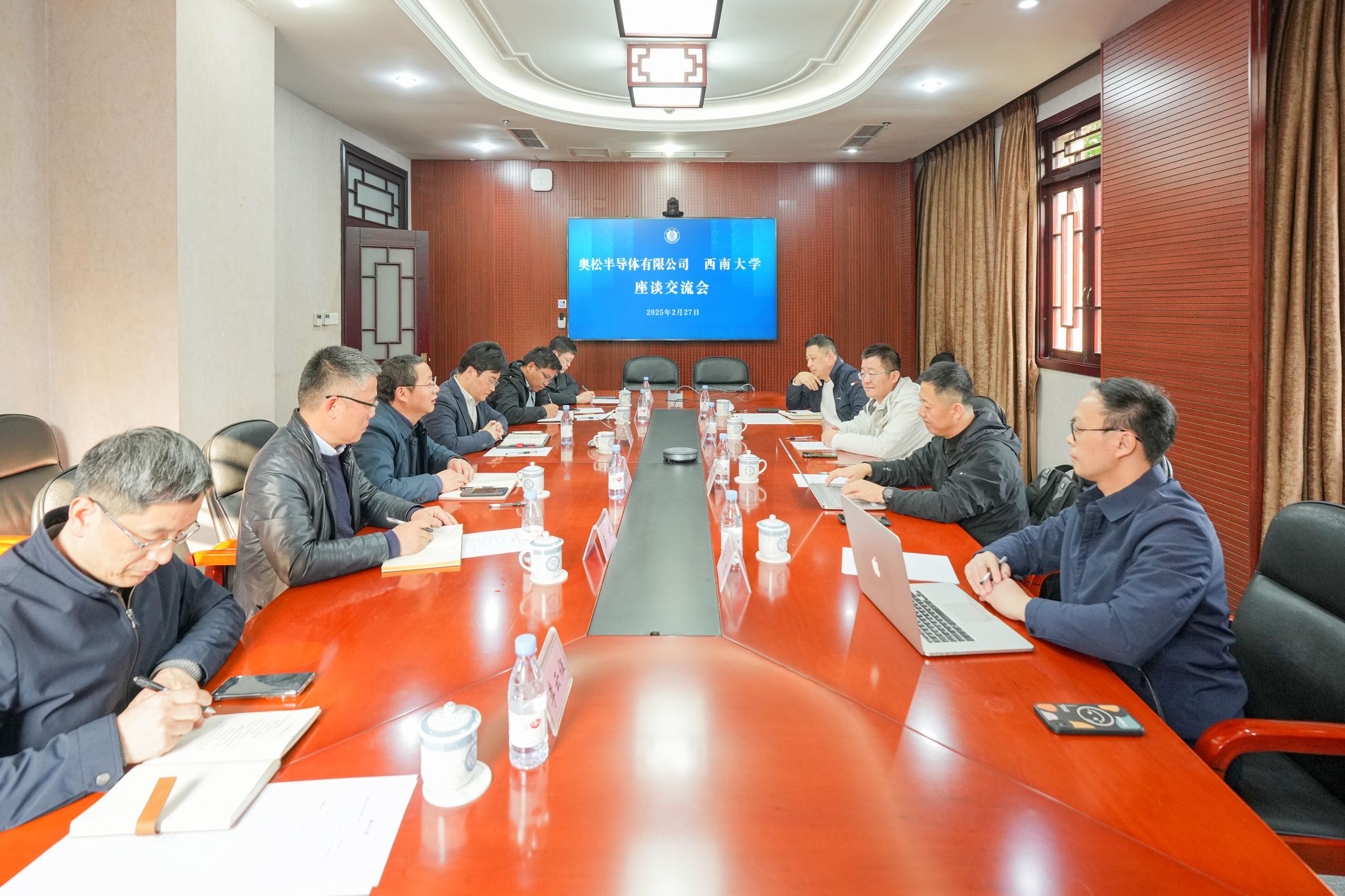 2月27日下午,党委书记张卫国会见广州奥松电子股份有限公司、奥松半导体(重庆)有限公司董事长张宾一行。党政办公室、社会服务处、材料与能源学院负责人参加会见。
