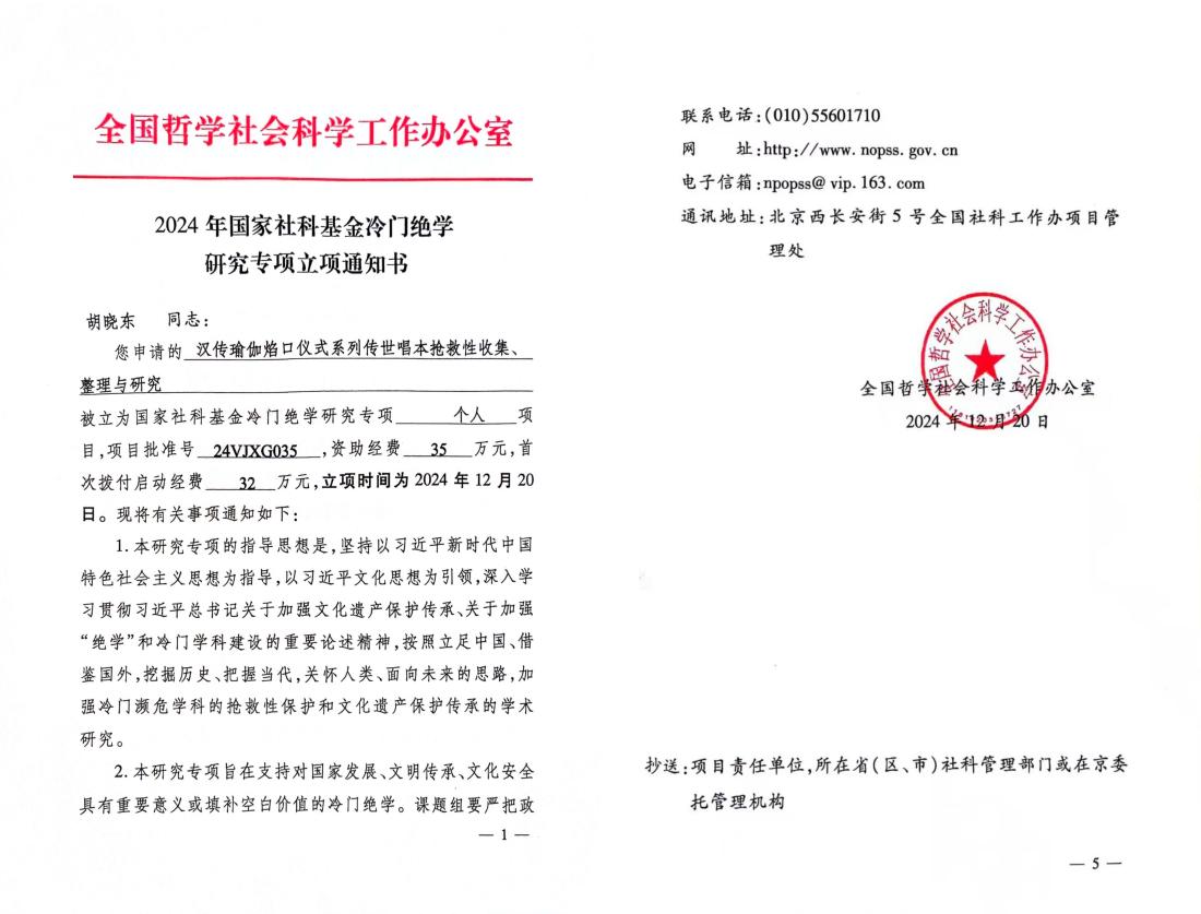 2024年12月,获立国家社科基金重点项目冷门绝学研究专项 。