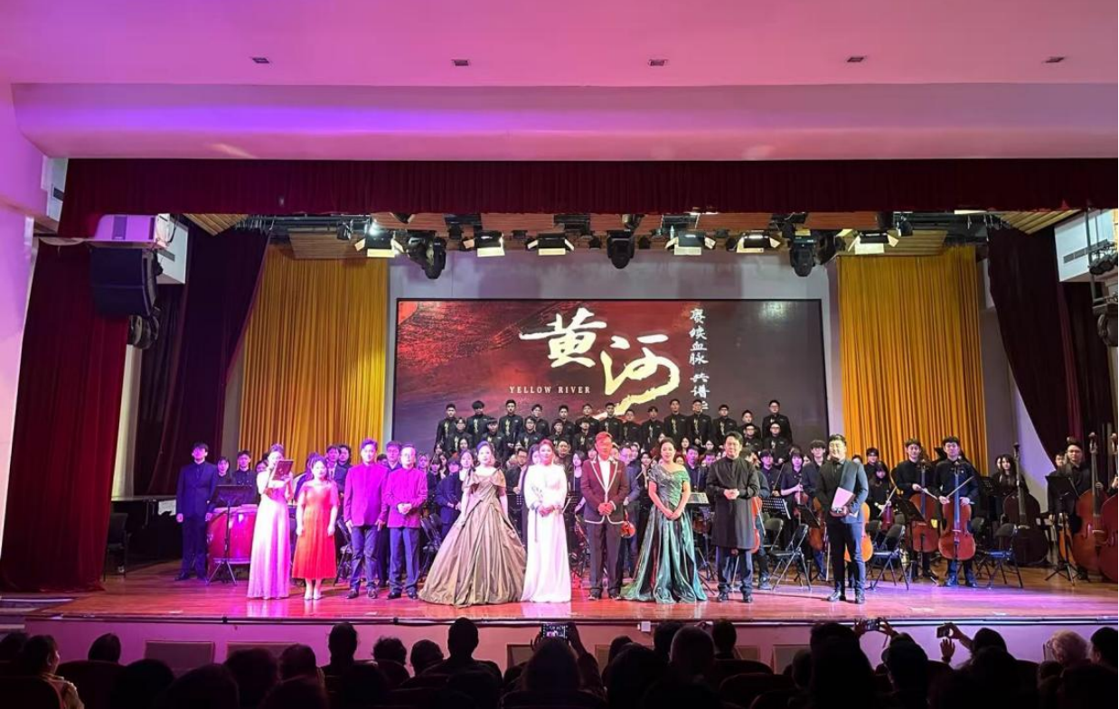 音乐会以关峡作曲的《第一交响序曲》拉开帷幕,在音乐学院副教授周楫的指挥下,交响乐团以激昂的旋律再现中华民族砥砺奋进的壮阔征程。重头戏钢琴协奏曲《黄河》由音乐学院陈若旭教授领衔演奏,作品包含《黄河船夫曲》《黄河颂》《黄河愤》《保卫黄河》四个乐章,以钢琴与交响乐的对话展现黄河儿女的坚韧抗争精神。中场休息后,《黄河大合唱》震撼登场,《黄河船夫曲》《黄河颂》《黄河之水天上来》《黄水谣》《保卫黄河》等系列经典作品更是在铿锵号子、深情朗诵、方言对答等创新形式中精彩呈现……在艺术之声中传承红色基因、致敬峥嵘岁月。