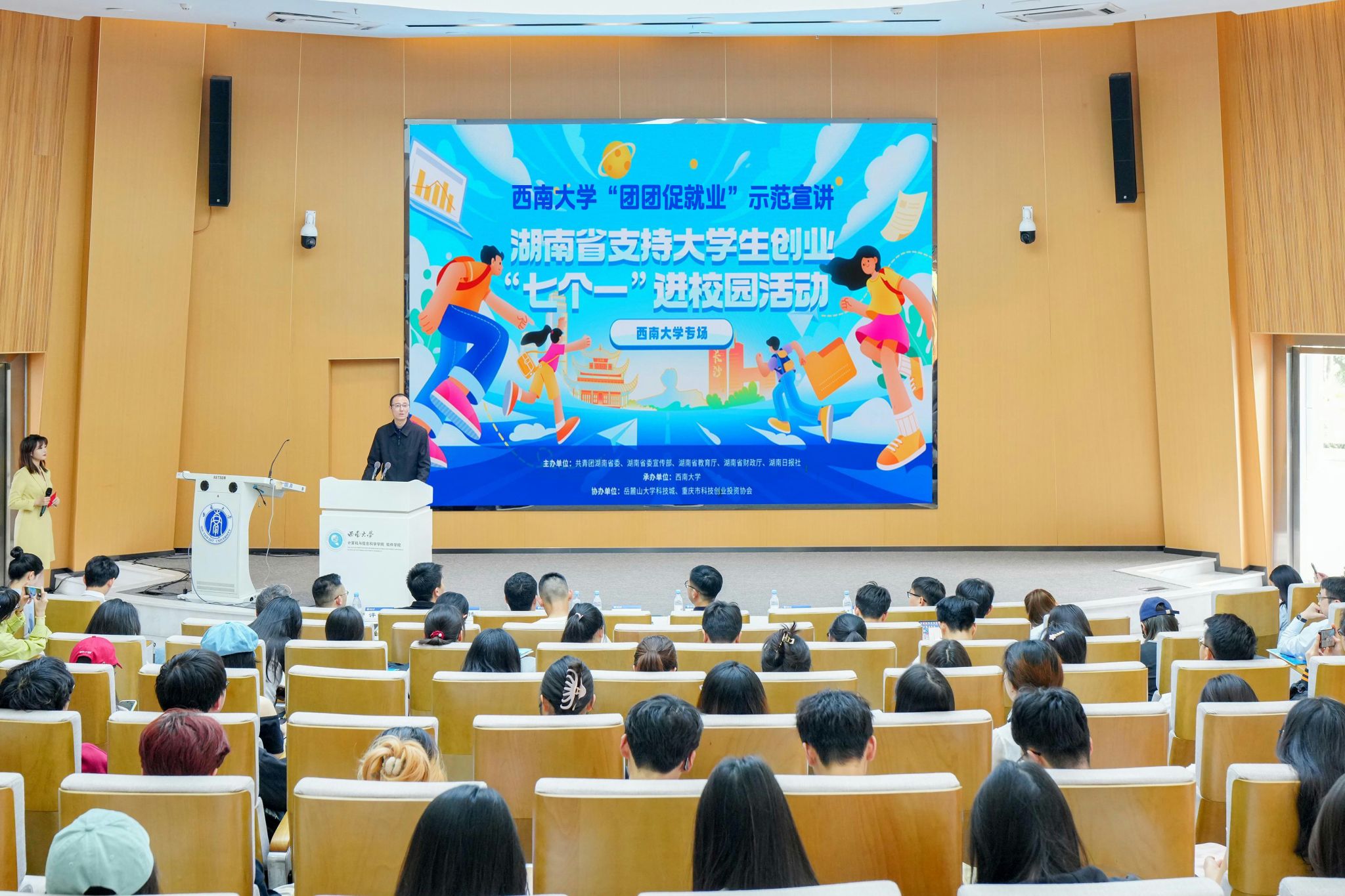 4月14日下午,校团委协同联动共青团湖南省委、湖南省委宣传部、湖南省教育厅、湖南省财政厅、湖南日报社等单位开展beat365在线唯一官网登录“团团促就业”示范宣讲暨湖南省支持大学生创业“七个一”进校园活动,旨在深化校地合作,搭建跨区域创新创业资源共享平台,为青年人才成长注入强劲动能。湖南团省委副书记邱帅萍、学校党委副书记黄杰出席,学校相关职能部门负责人、学生代表共200余人参加活动。