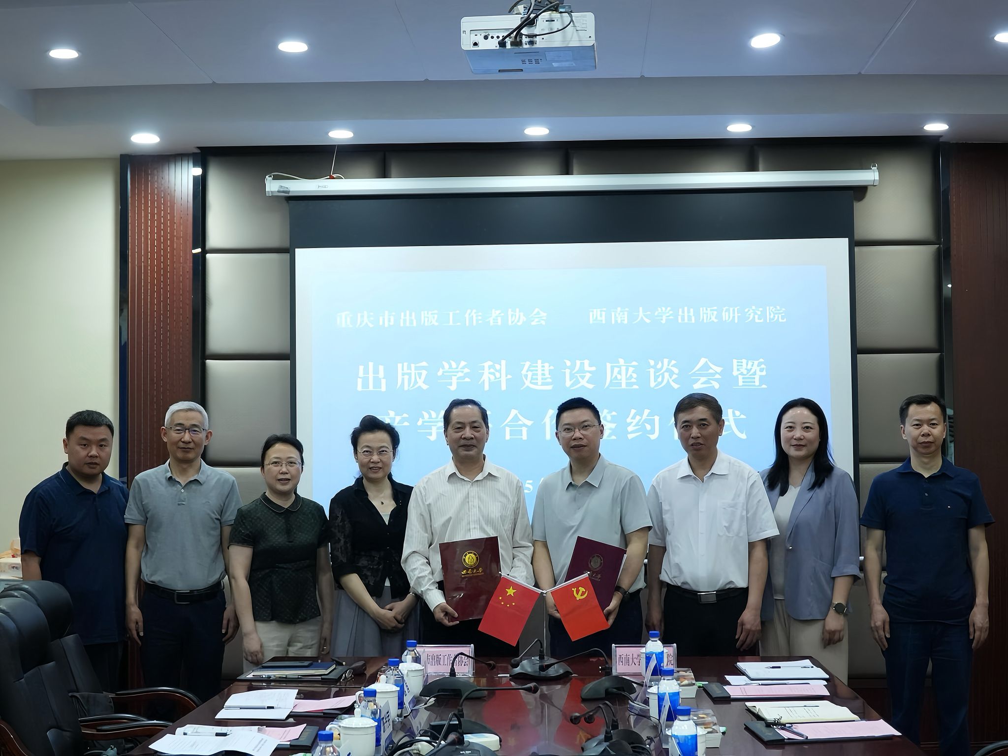 4月21日上午,重庆市出版工作者协会、beat365在线唯一官网登录出版研究院出版学科建设座谈会暨产学研合作签约仪式在新闻传媒学院举行。重庆市出版工作者协会和beat365在线唯一官网登录出版研究院相关领导出席会议。