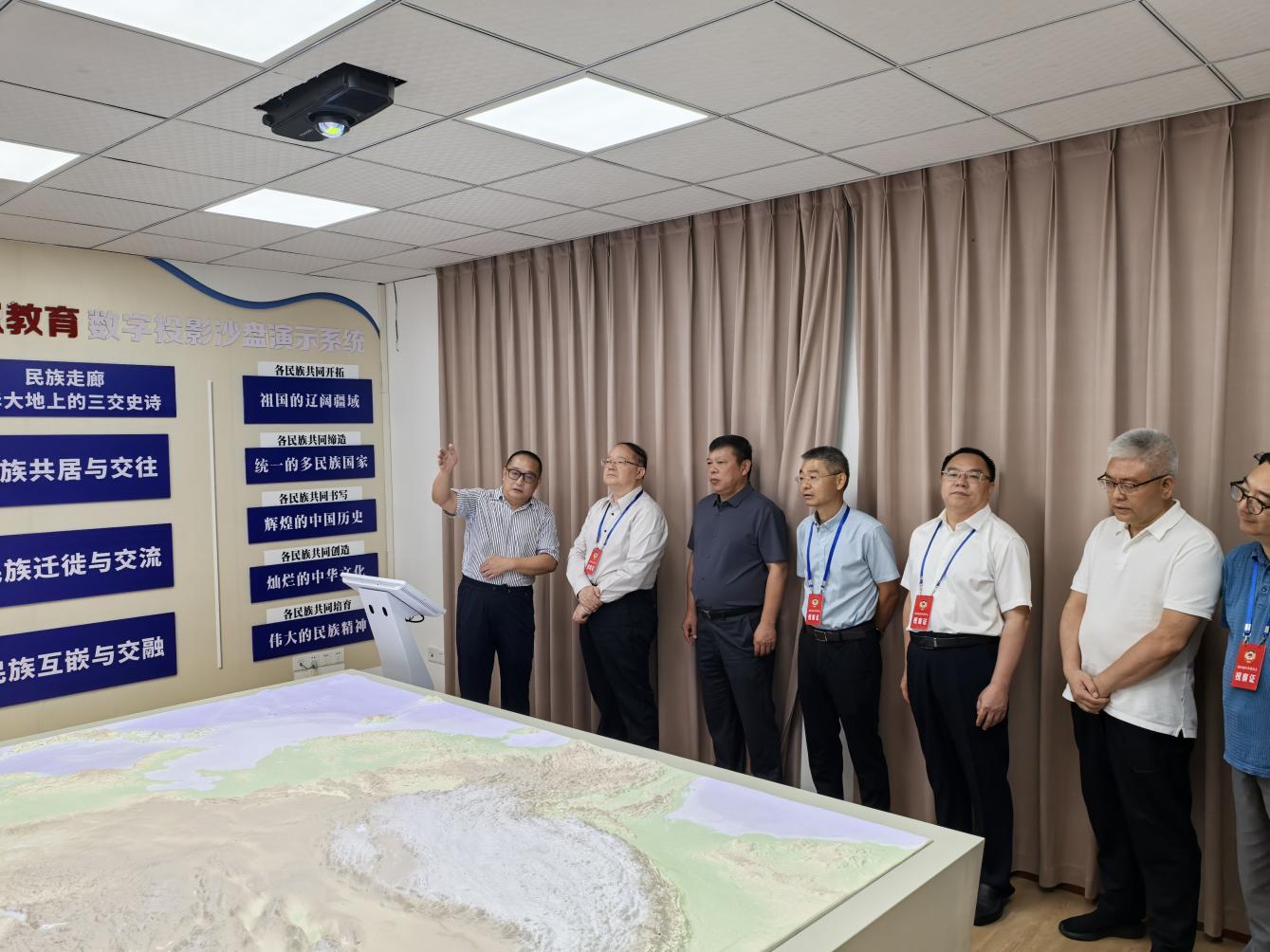 视察期间,周勇一行来到学校铸牢中华民族共同体意识教育实验室,听取学校中华民族共同体相关科研情况介绍,观看实验室沙盘演示,与科研人员交流。