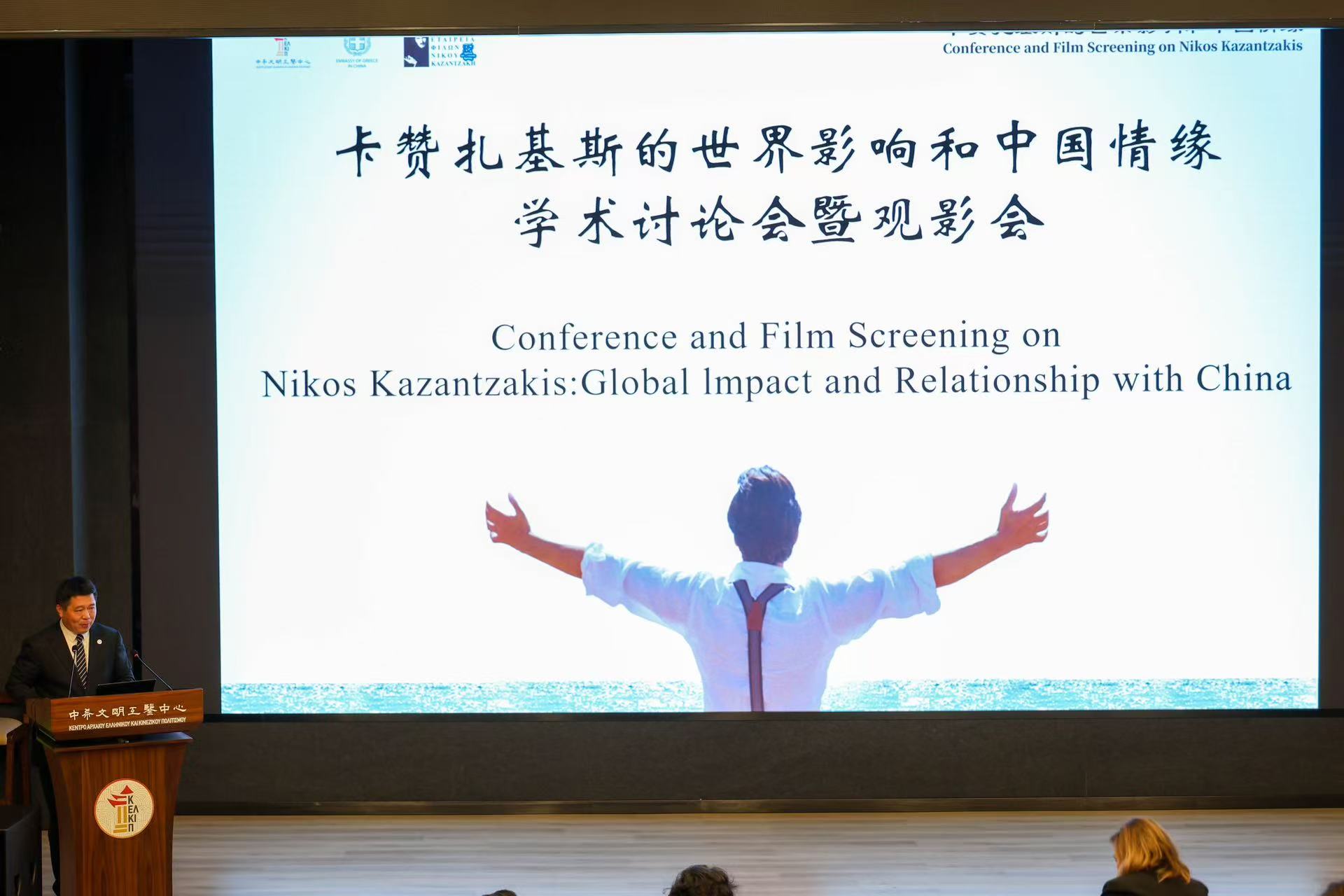 主旨演讲结束后,与会人员共同观看了欧洲科学院院士扬尼斯・斯马拉格迪斯执导的纪录电影《卡赞扎基斯》,回顾了卡赞扎基斯的精彩人生和深邃思想。