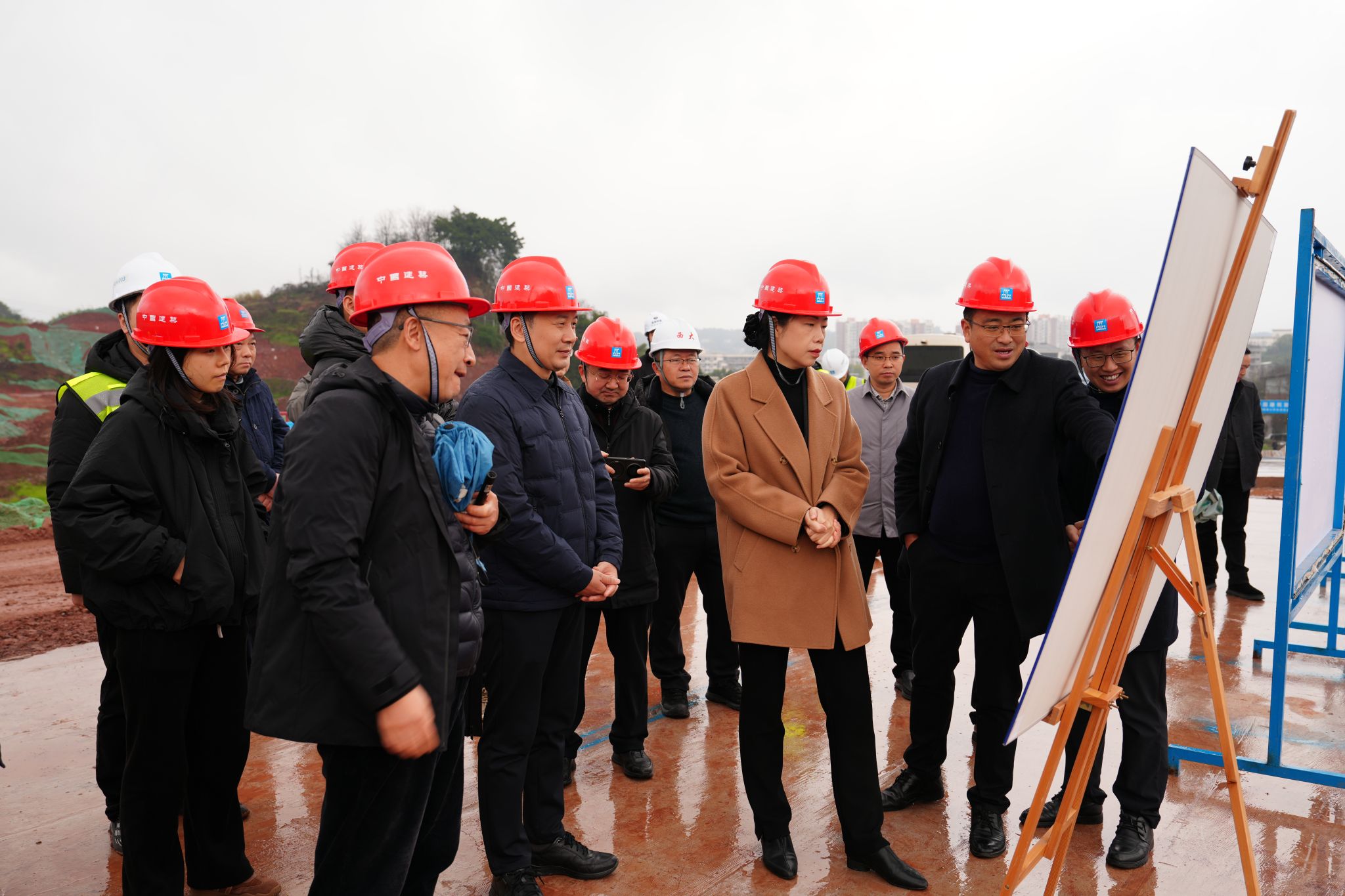 在项目现场,万容一行实地察看了基地建设情况,并听取了荣昌校区管委会关于校区整体校园规划及基本建设工作的详细汇报。