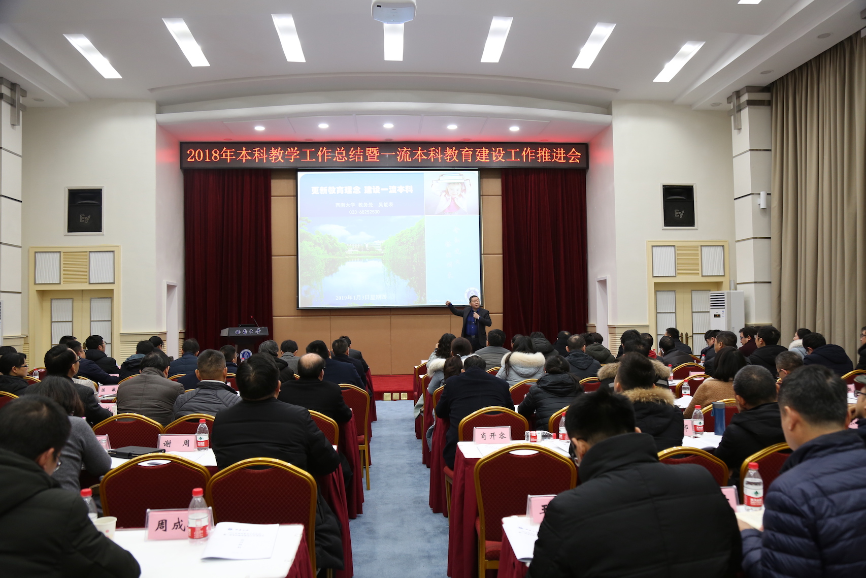 2018年本科教学工作总结暨一流本科教育建设工作推进会1月3日在桂园宾馆金桂厅召开。会议邀请了原厦门大学副校长邬大光教授作主题报告,beat365在线唯一官网登录副校长靳玉乐出席会议并讲话,各学院(部)分管本科教学工作副院(部)长、各专业负责人,党委宣传部 党委网络工作部、团委、教务处等职能部门负责人参加会议。会议由靳玉乐副校长主持。