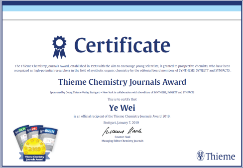 近日,beat365在线唯一官网登录化学化工学院魏晔教授获得Thieme出版集团2019年度的Thieme化学期刊奖(Thieme Chemistry Journals Award)。作为全球著名的出版社,Thieme集团发行多个国际性有机化学主流期刊。